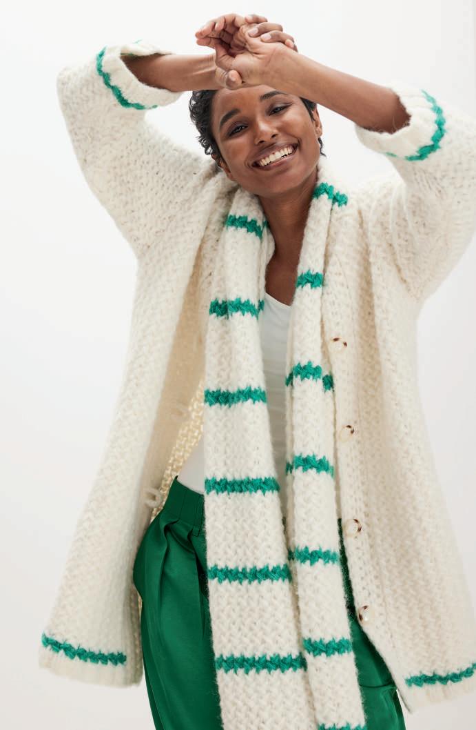 Auf den ersten Blick beinahe unspektakulär: der verschlusslose Cardigan im klassischem Halbpatentmuster.
