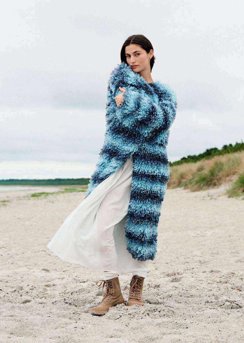 Gleich fünf kostbare Fasern – Alpaka, Seide, Merino, Biobaumwolle und Kaschmir – bilden einen zarten Verlauf. Während der verschlusslose Maxi-Mantel kraus rechts gestrickt wird, entsteht der lange Schal im klassischen Patent-Muster. Wenn Träume wahr werden: Diese beiden Teile sind zwei davon.