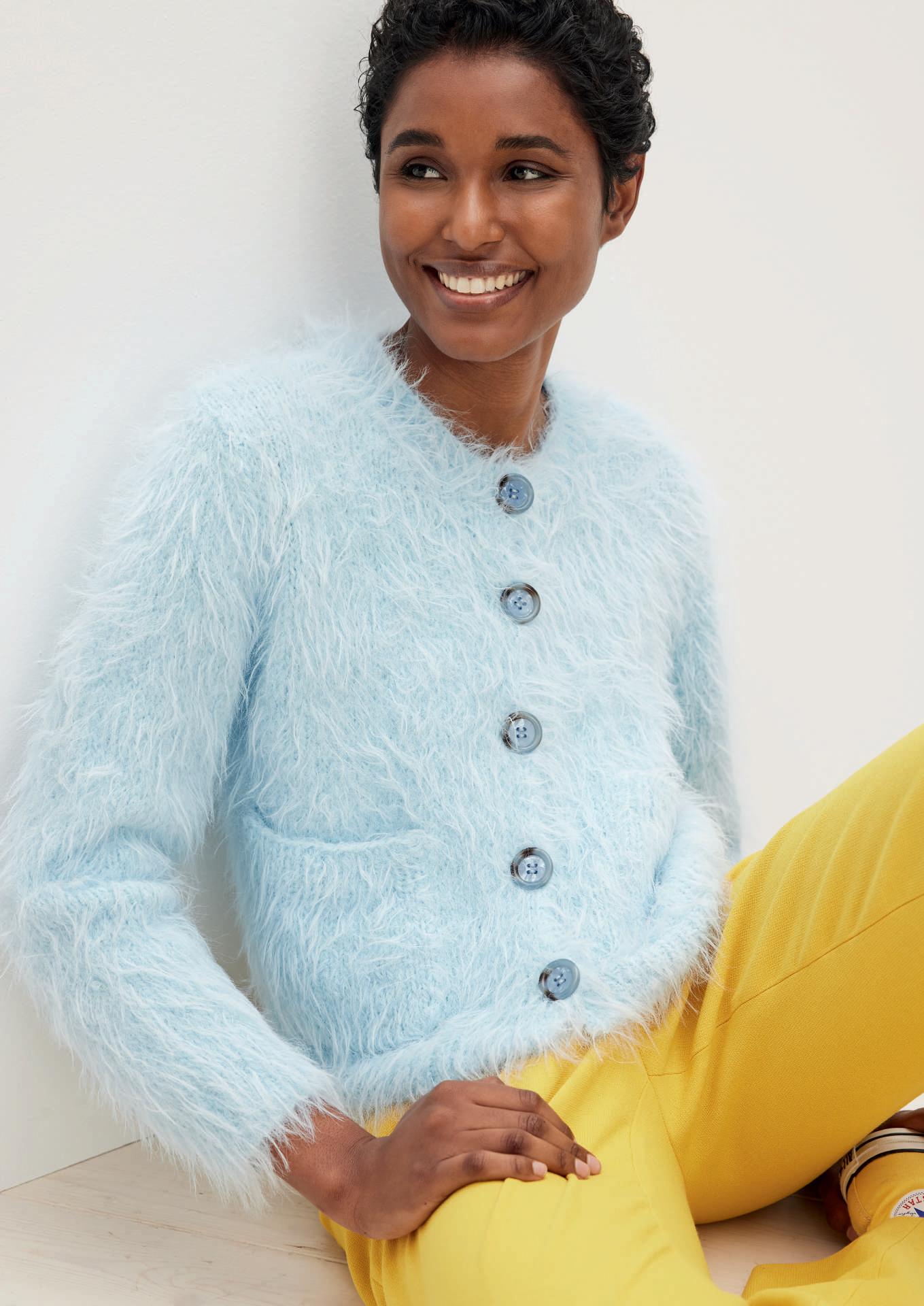 Der Schnitt klassisch, die Farbe ein Kracher: Wo steht eigentlich, dass Essentials wie graue Mäuse daherkommen müssen? Mit ultra angesagtem Fake Fur-Garn gestrickt, mischt diese Jacke (auch in neutralem Farbton) schlichte Outfits auf. Muss man einfach haben, basta!