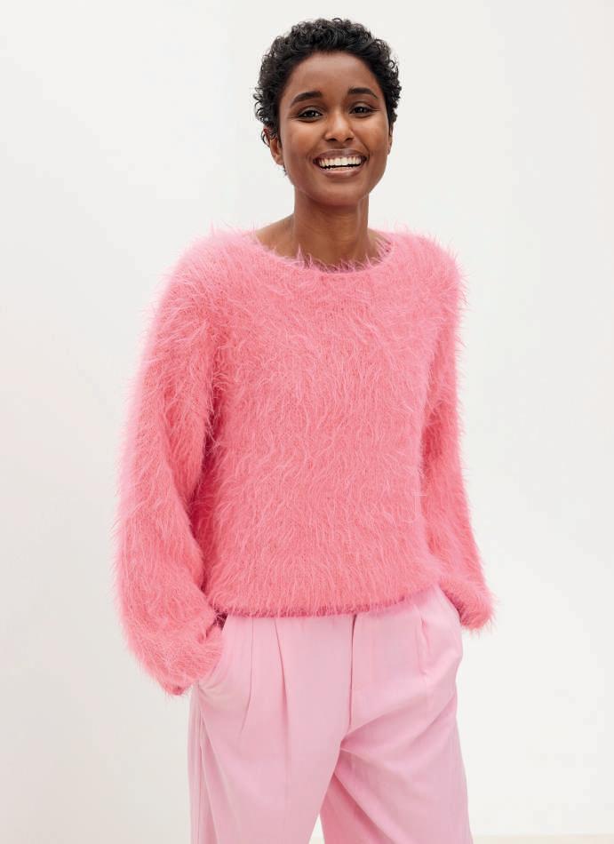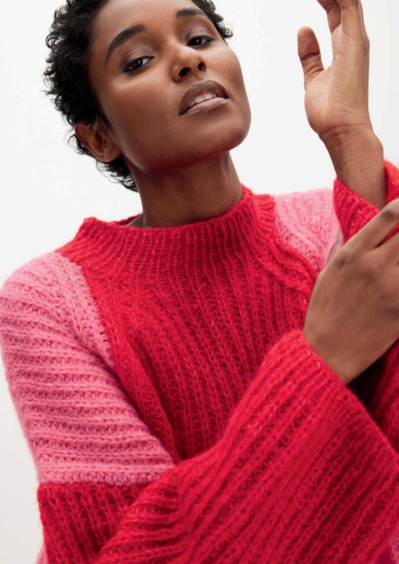 Cool wird's durch die freche Kombination von Pink mit Orange und einem Materialmix aus flauschigem Mohair und glattem Merino für die Bündchen. COOL MERINO & MOHAIR MODA