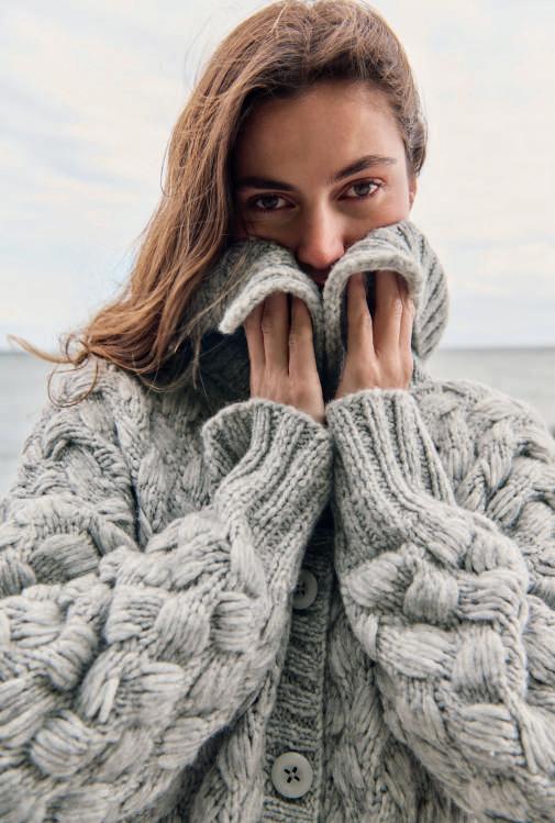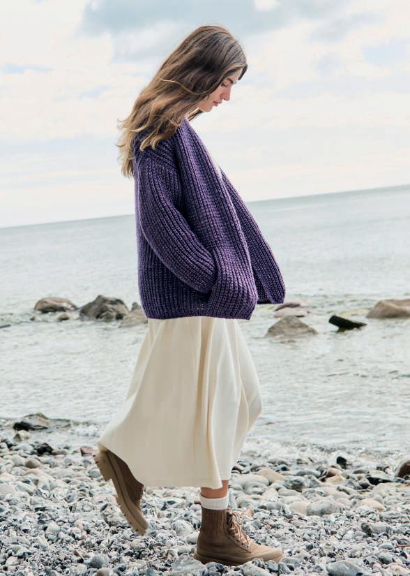 22 / 23 - Mütze und Pullover Einfarbig verstrickt, kommt der leicht changierende Effekt des fingerdicken Dochtgarns besonders gut zur Geltung. Achtung, Spoiler-Alarm! Auch für dieses Paar gibt’s ein Happy End, denn beide Teile sind ebenfalls ratzfatz gestrickt.