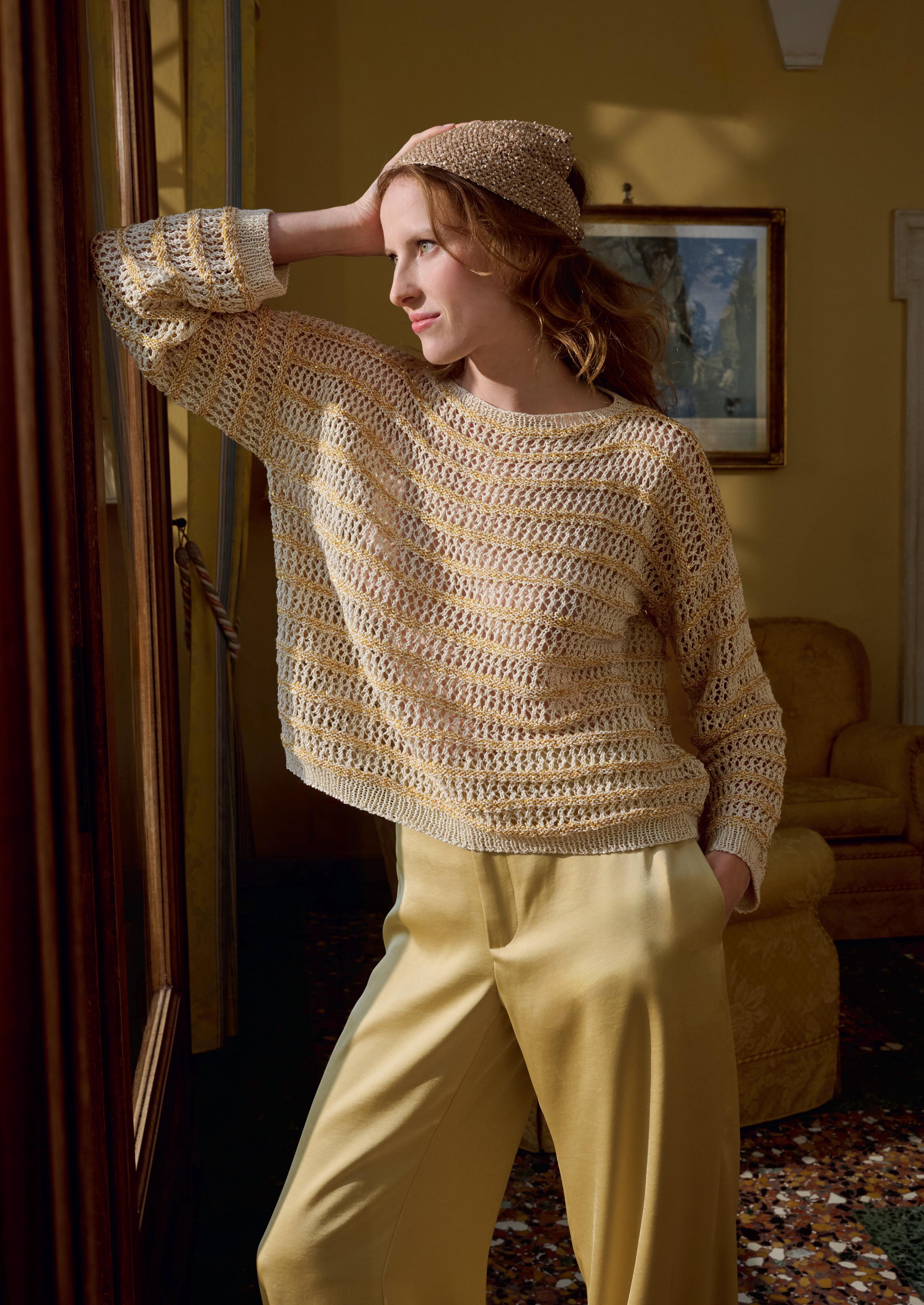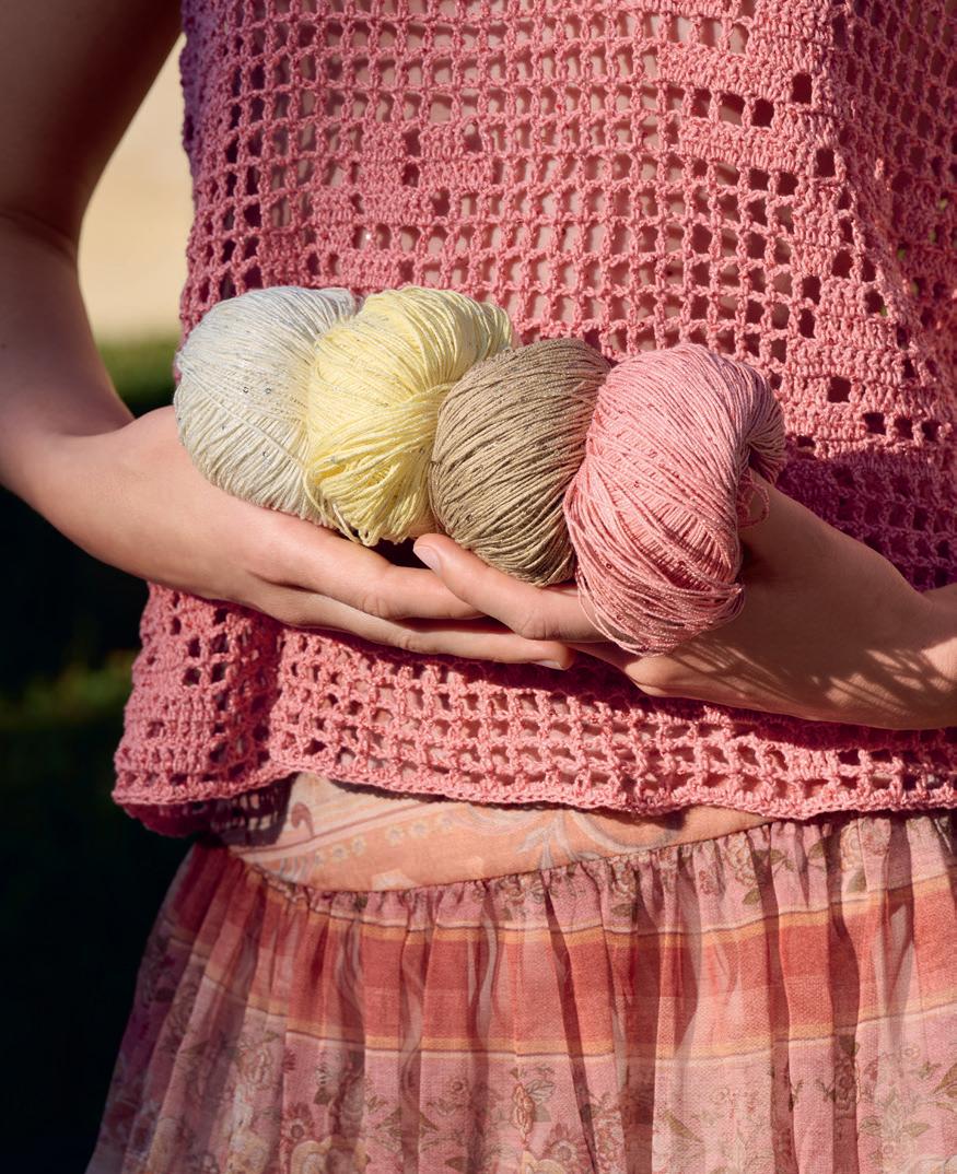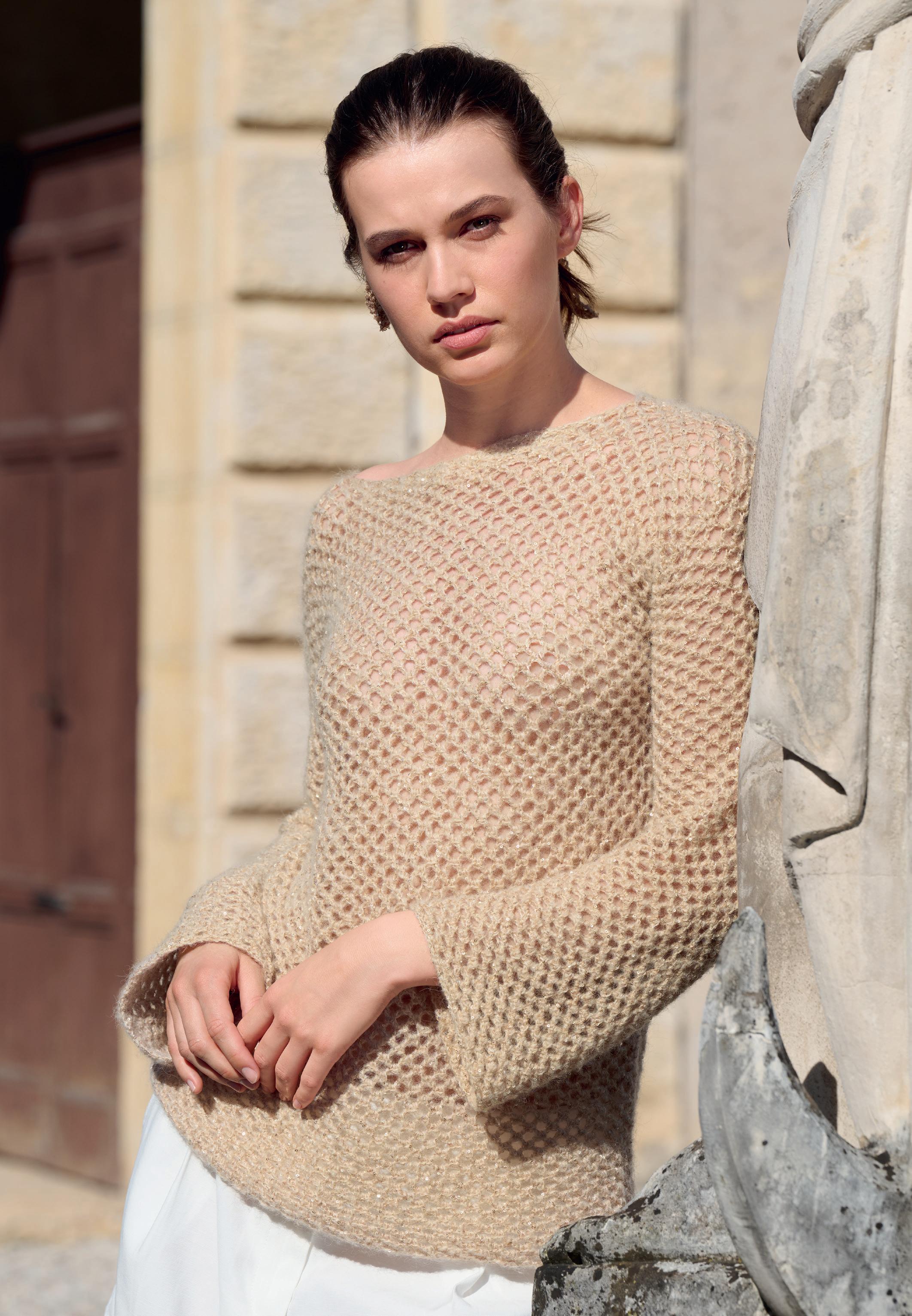 Modell 13: Weiches Schlauchgarn und eine paillettenbesetzte Qualität ergeben diesen luftigen Luxus-PULLOVER , der rund um die Uhr funktioniert. Infos zum KOPFTUCH finden Sie auf Seite 9. SUMMER SOFTNESS & GLAMOUR