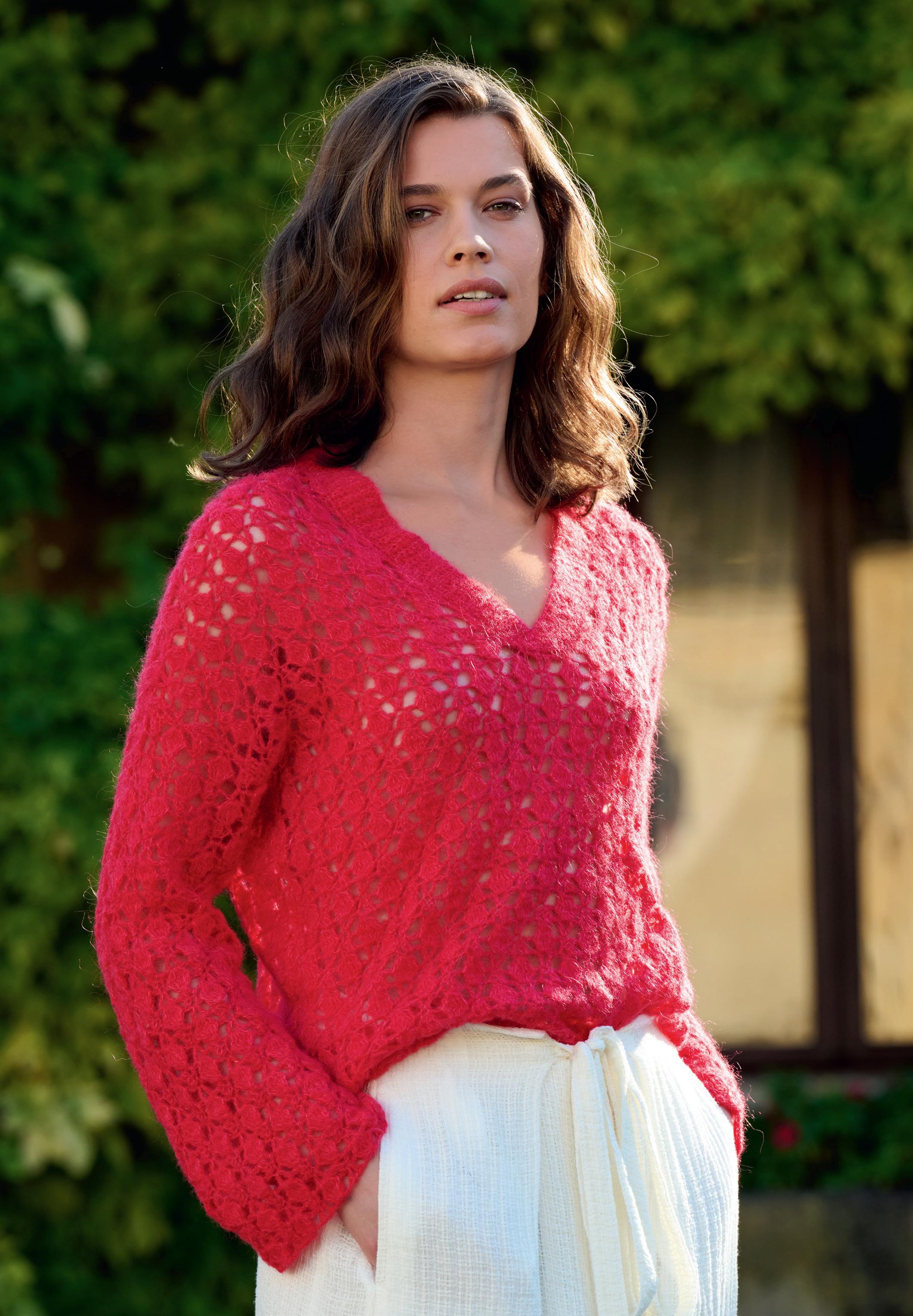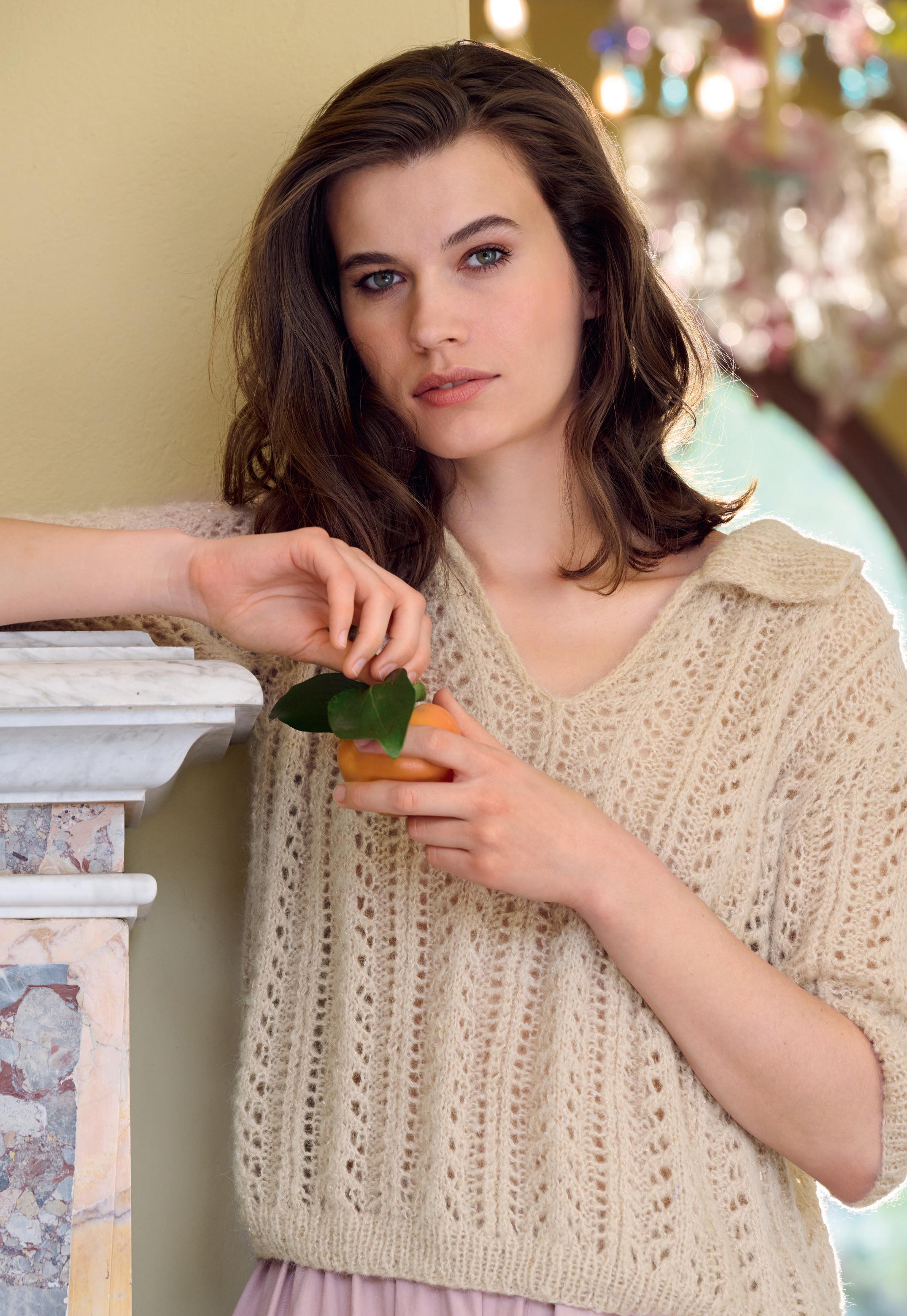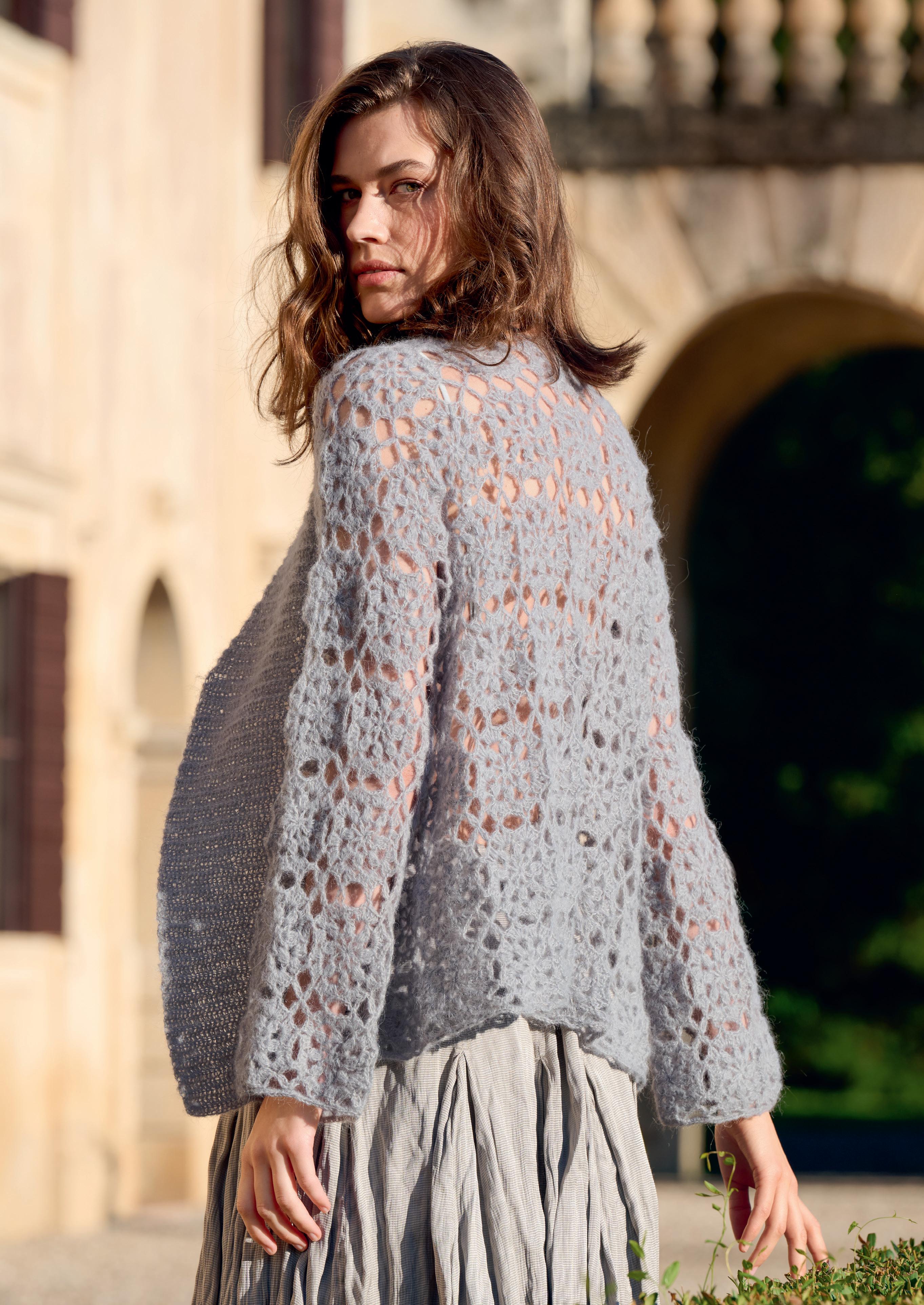 Modell 5: Flausch und Pailletten, dazu ein durchbrochenes Häkelmuster: Ein PULLOVER für Tag und Nacht. SETASUR I& GLAMOUR