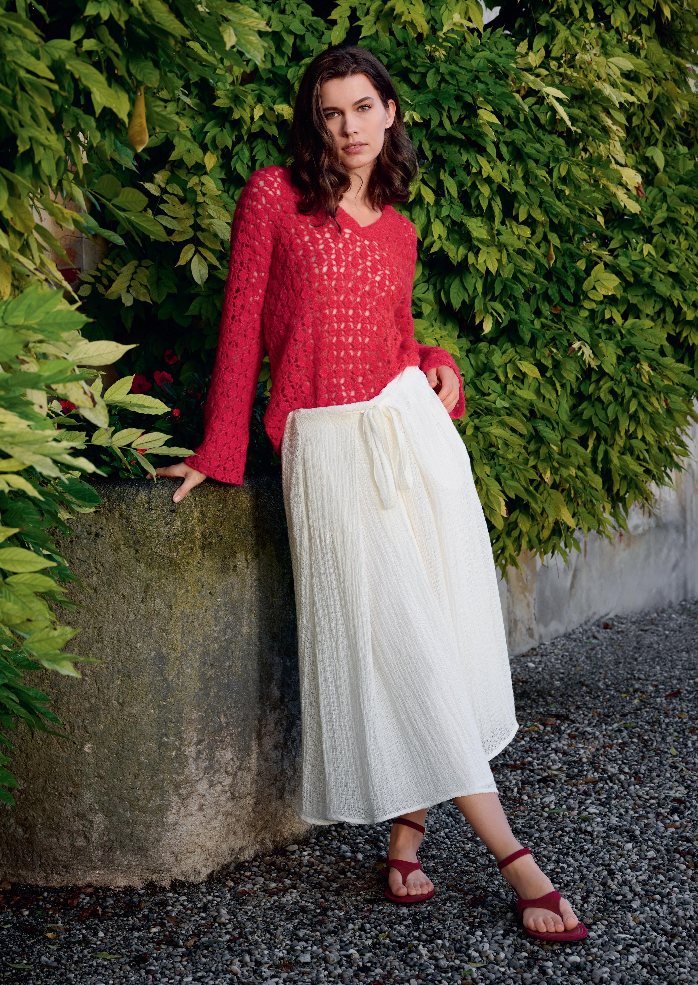 Modell 32: Orientrot heißt die elegante Farbe für dieses MINIKLEID im Filethäkelmuster. Die Silhouette ist gerade, das Garn angenehm leicht und weich. SUMMER CASHMERE