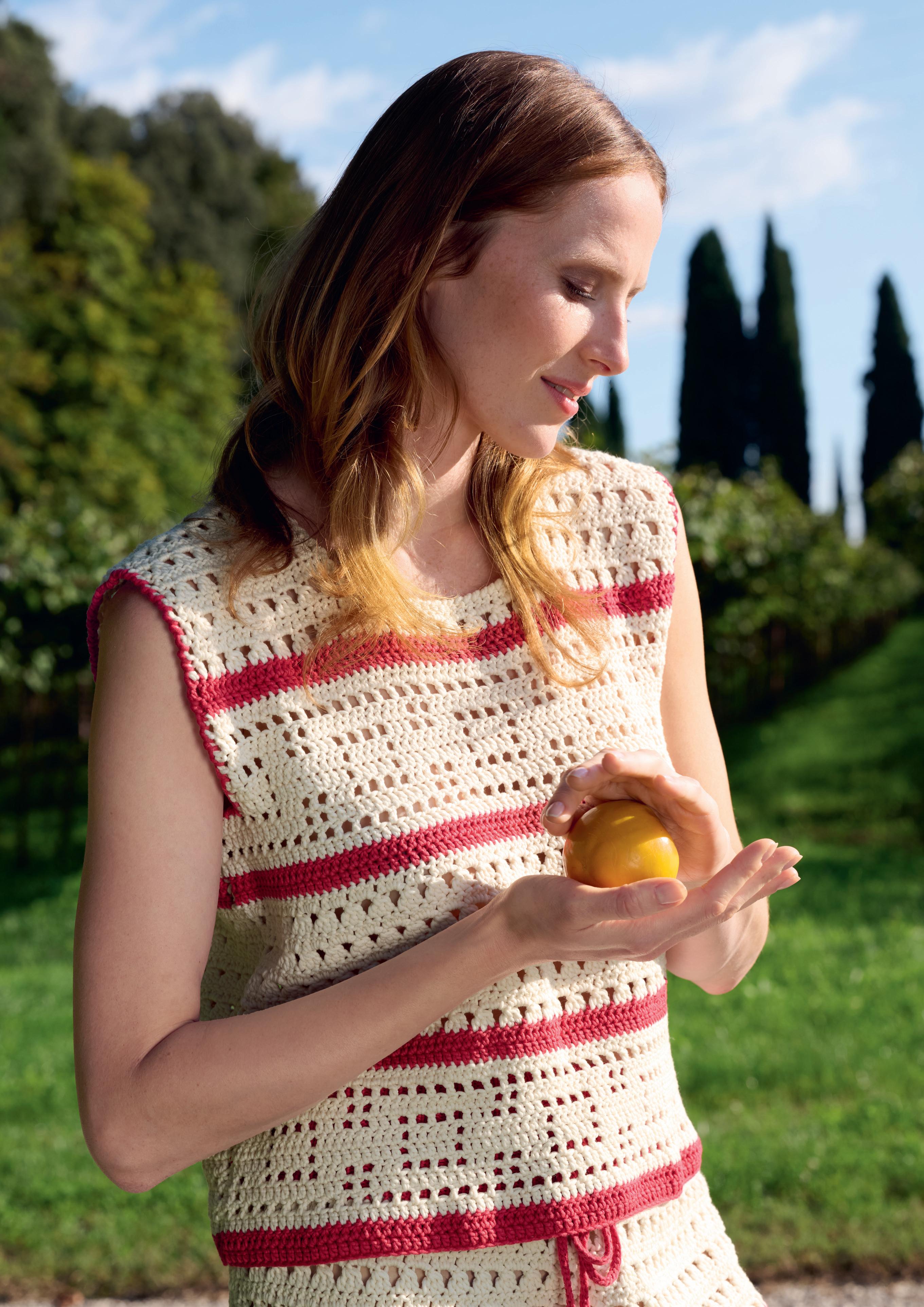 Modell 25&26: Streifen und ein luftiges Kästchenmuster bringen Abwechslung in das gehäkelte ENSEMBLE Damit der Rock nicht von den Hüften rutscht, wird sein Rippenbund ausnahmsweise gestrickt.