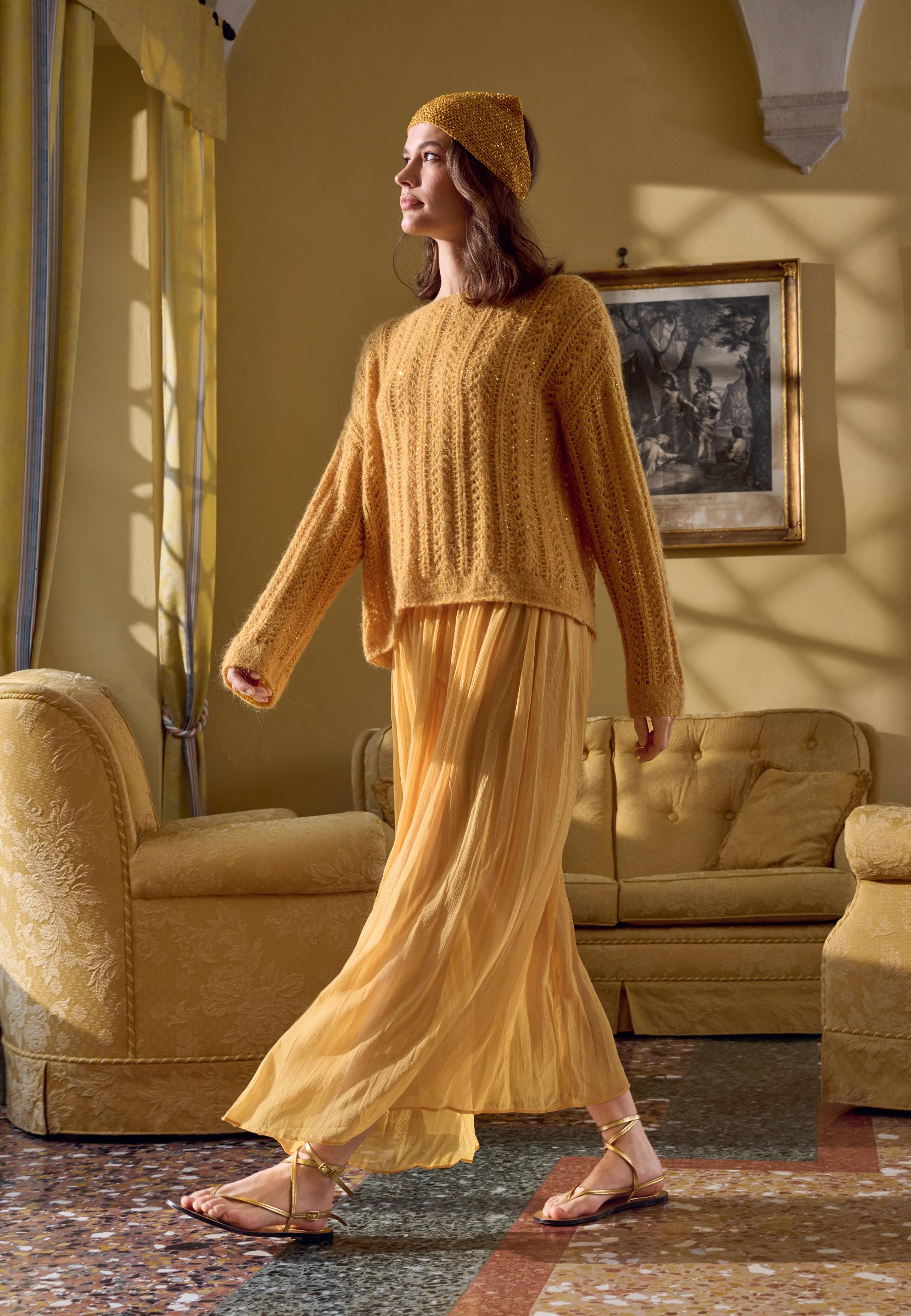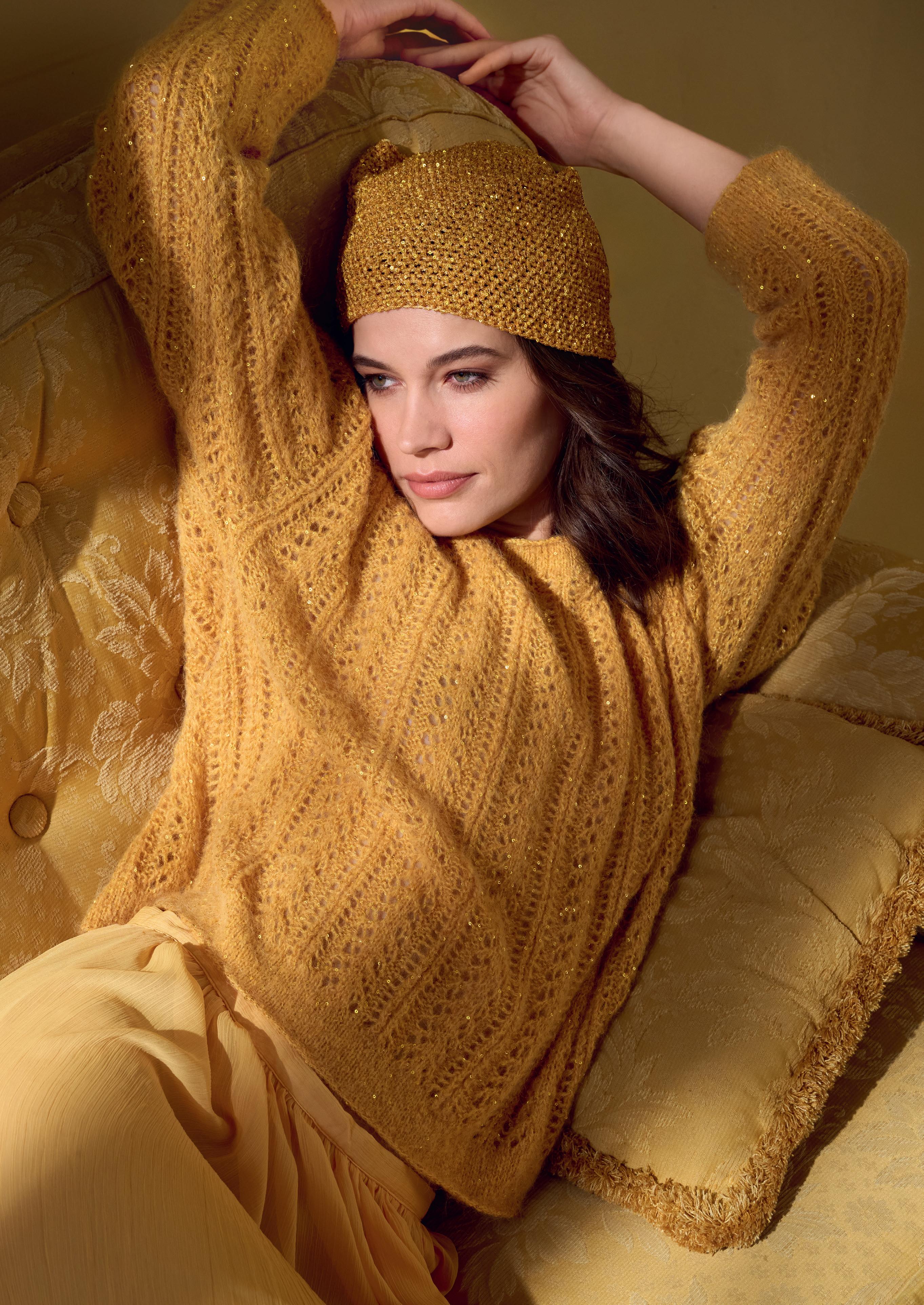 Modell 1: Che bello: Beim dottergelben PULLOVER ergeben Flausch, Pailletten und filigrane Strukturen eine entspannt-elegante Komposition. Das doppelfädig gestrickte Modell besteht aus SETASUR I& GLAMOUR