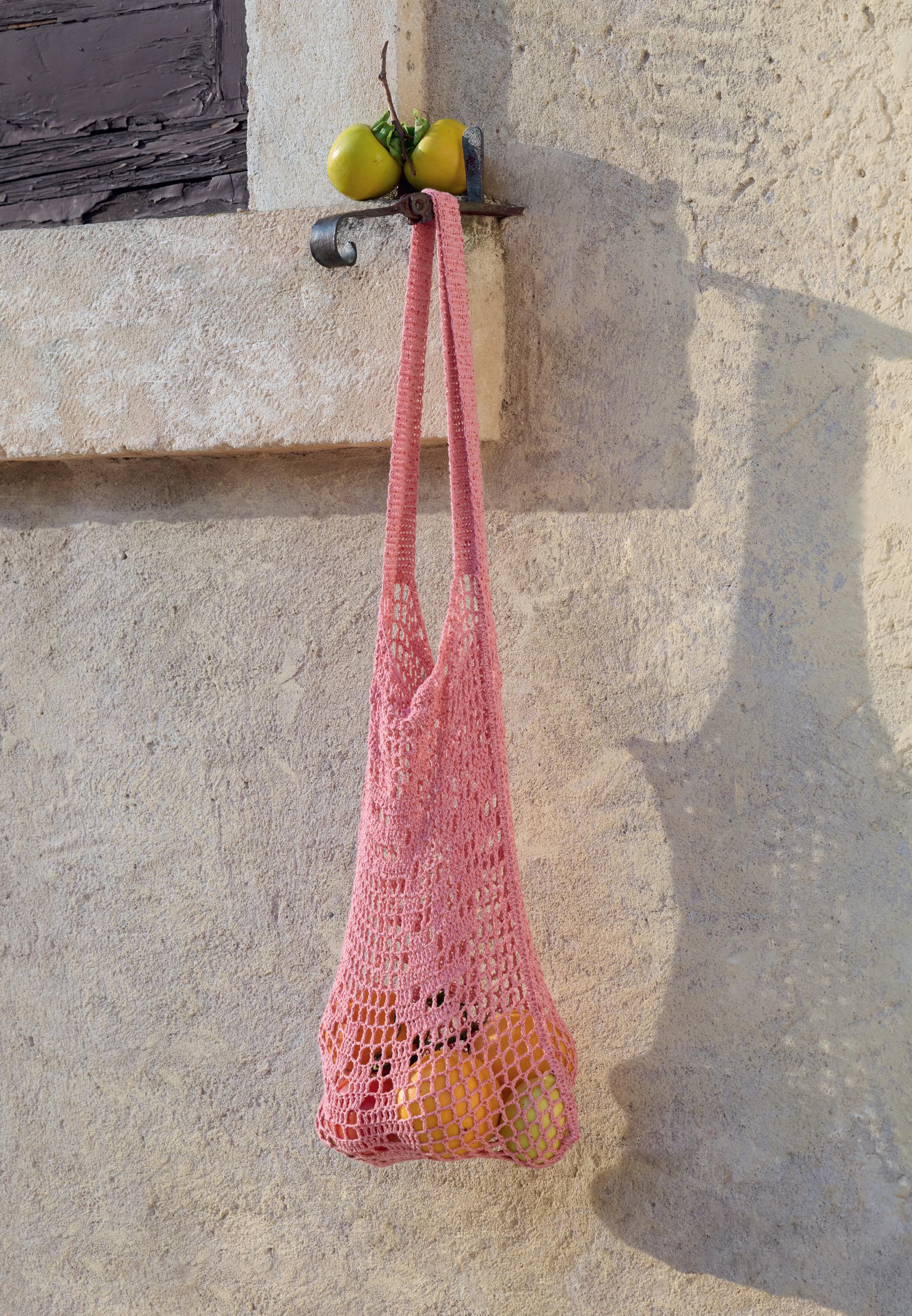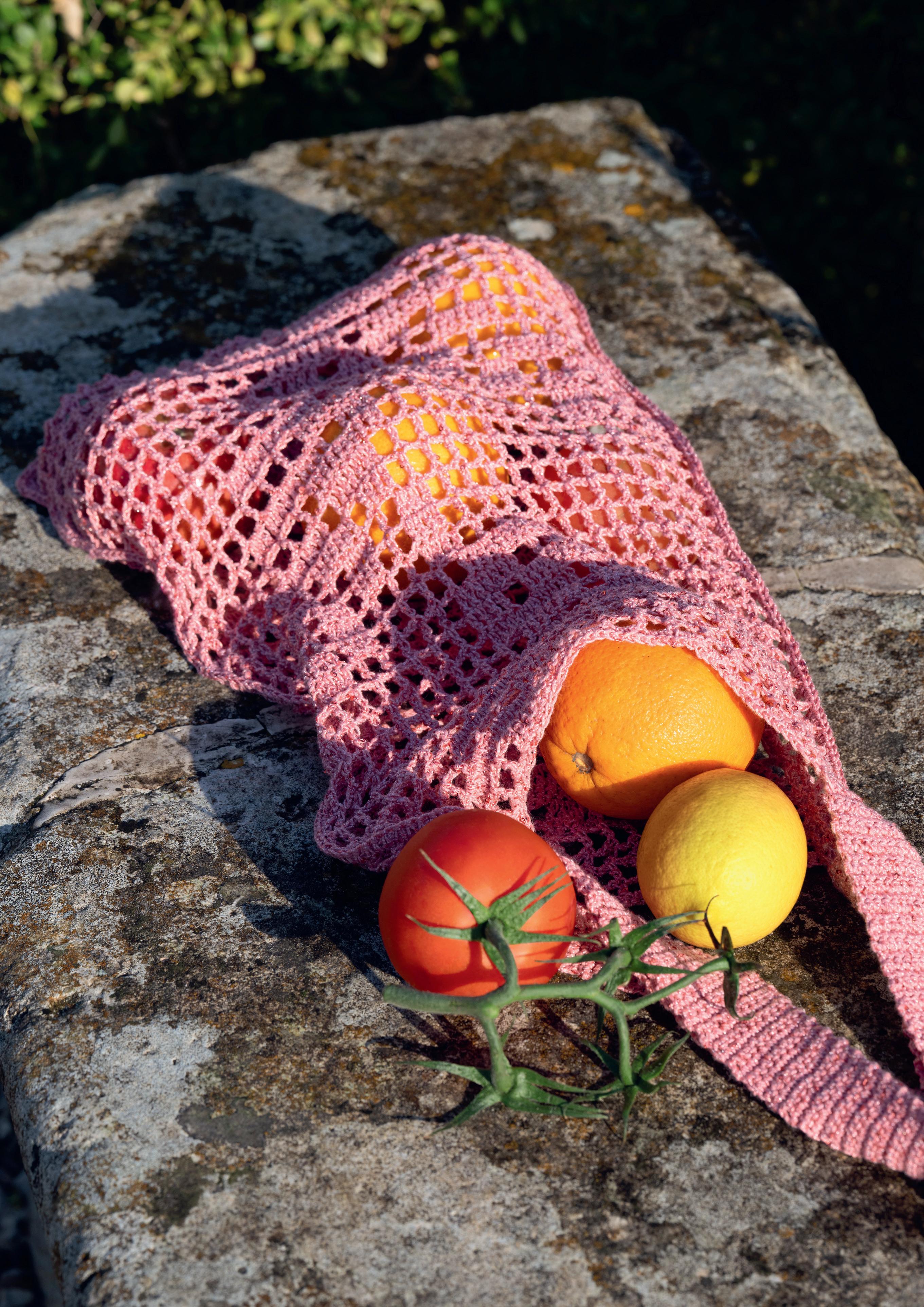 Modell 31: Passt perfekt zum Top von Seite 48/49: das gehäkelte Einkaufsnetz im floralen Filetmuster. FILO PAILLETTES