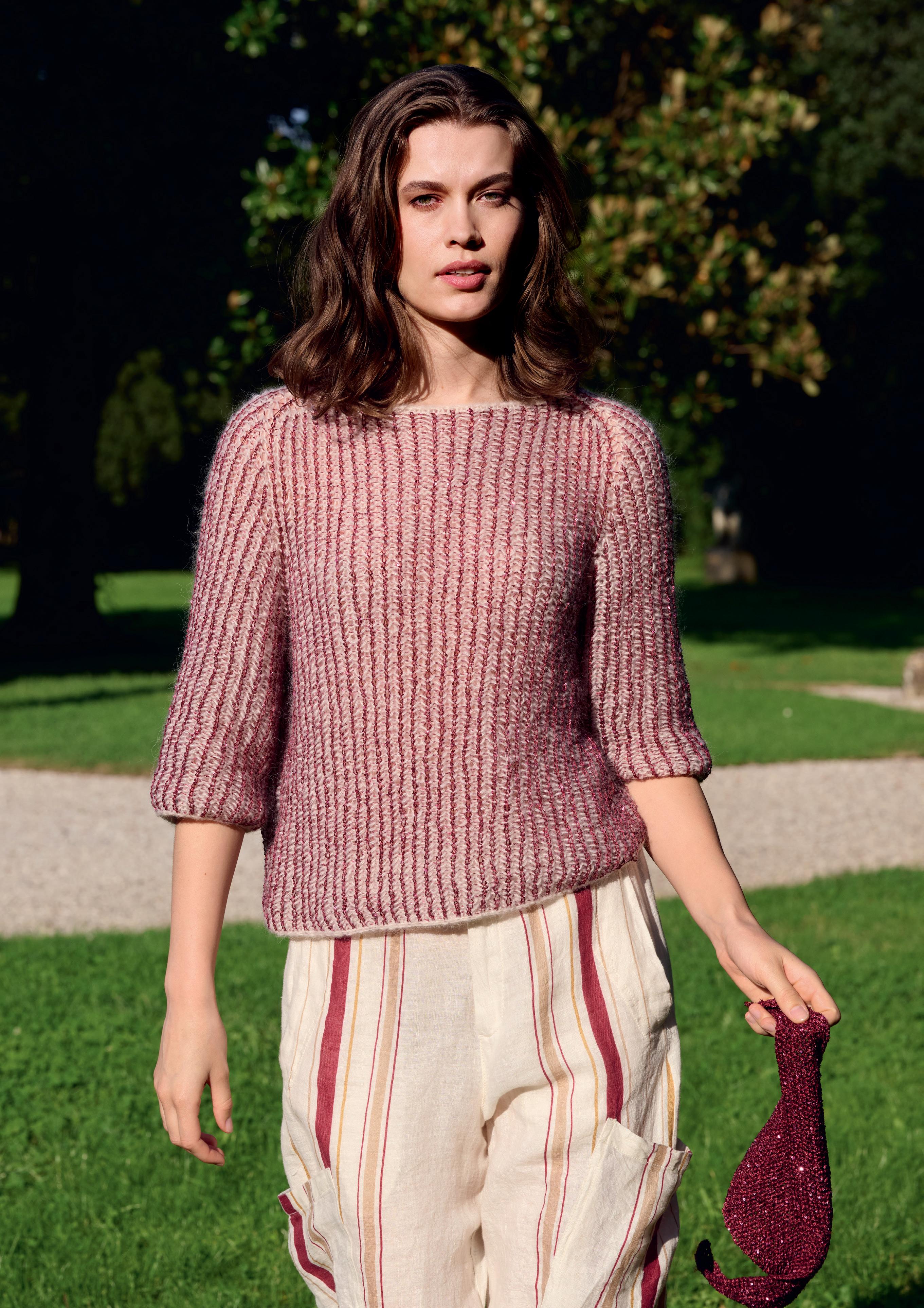 Modell 27&28: Streifen aus vier verschiedenen Qualitäten bringen Struktur und Glanz in das klassische TWIN-SET Gestrickt wird überwiegend kraus rechts.