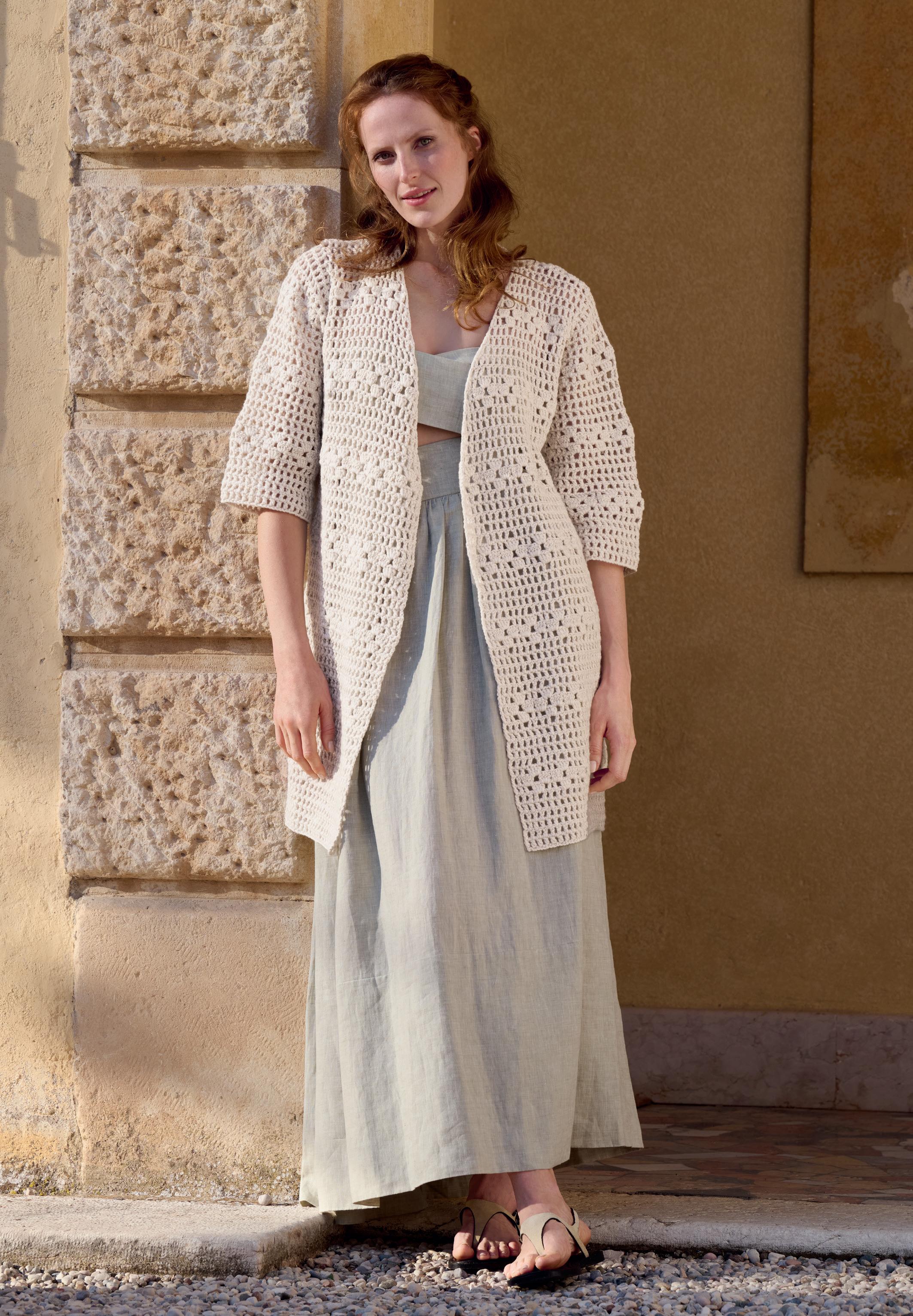 Modell 16: Unser verschlussloser Häkel- CARDIGAN schmeichelt mit einer langen, lockeren Silhouette und weichem Schlauchgarn in Kalkweiß.