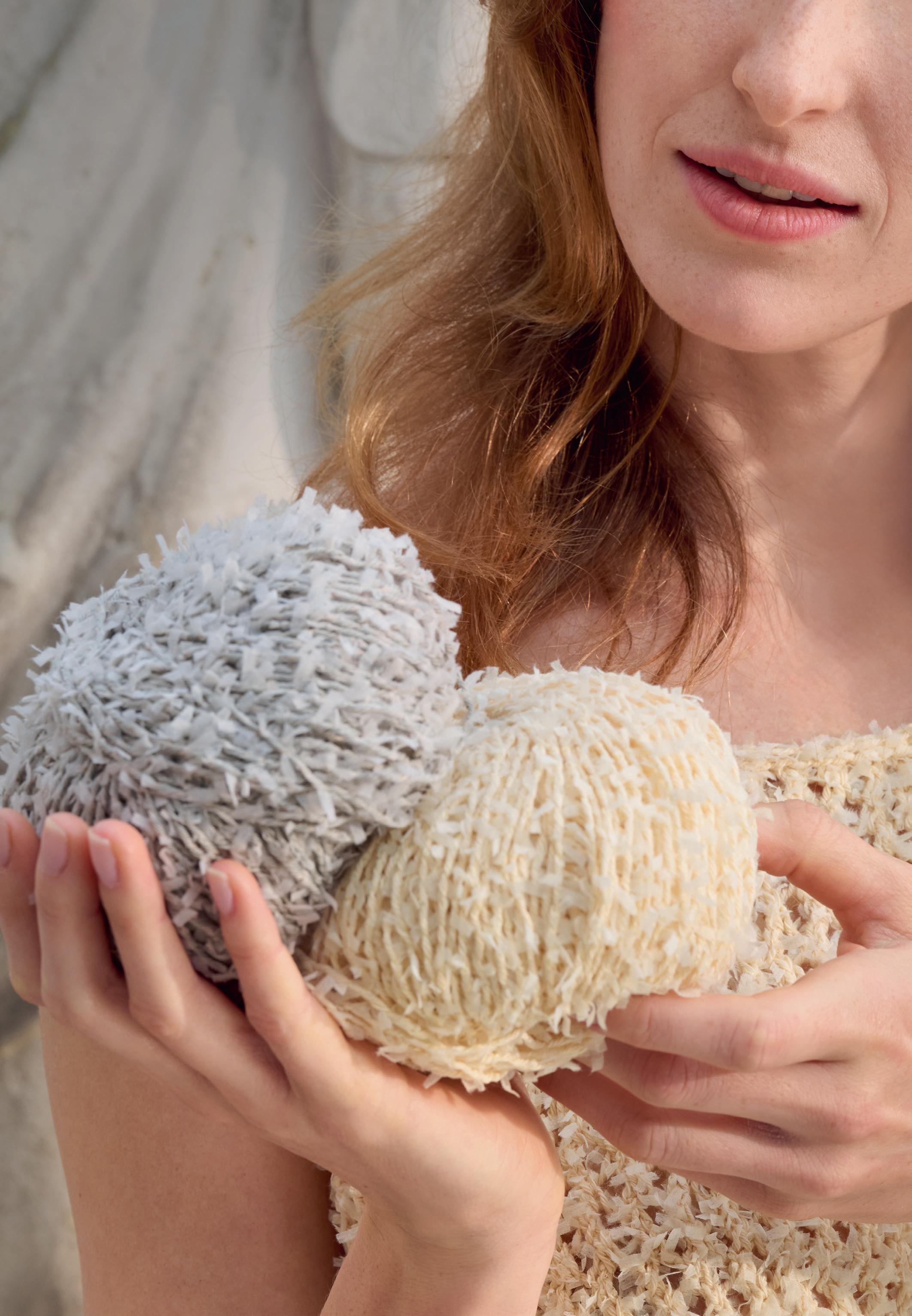 Hier wurden einfache Baumwollfäden mit einer Konstruktion aus kurzen, papierartigen Streifen kombiniert. Das Ergebnis sind schäumend-prickelnde Strickbilder, die jedem Modell eine tolle Optik verleihen. Unser Neuzugang ist in 16 Farben zu haben.