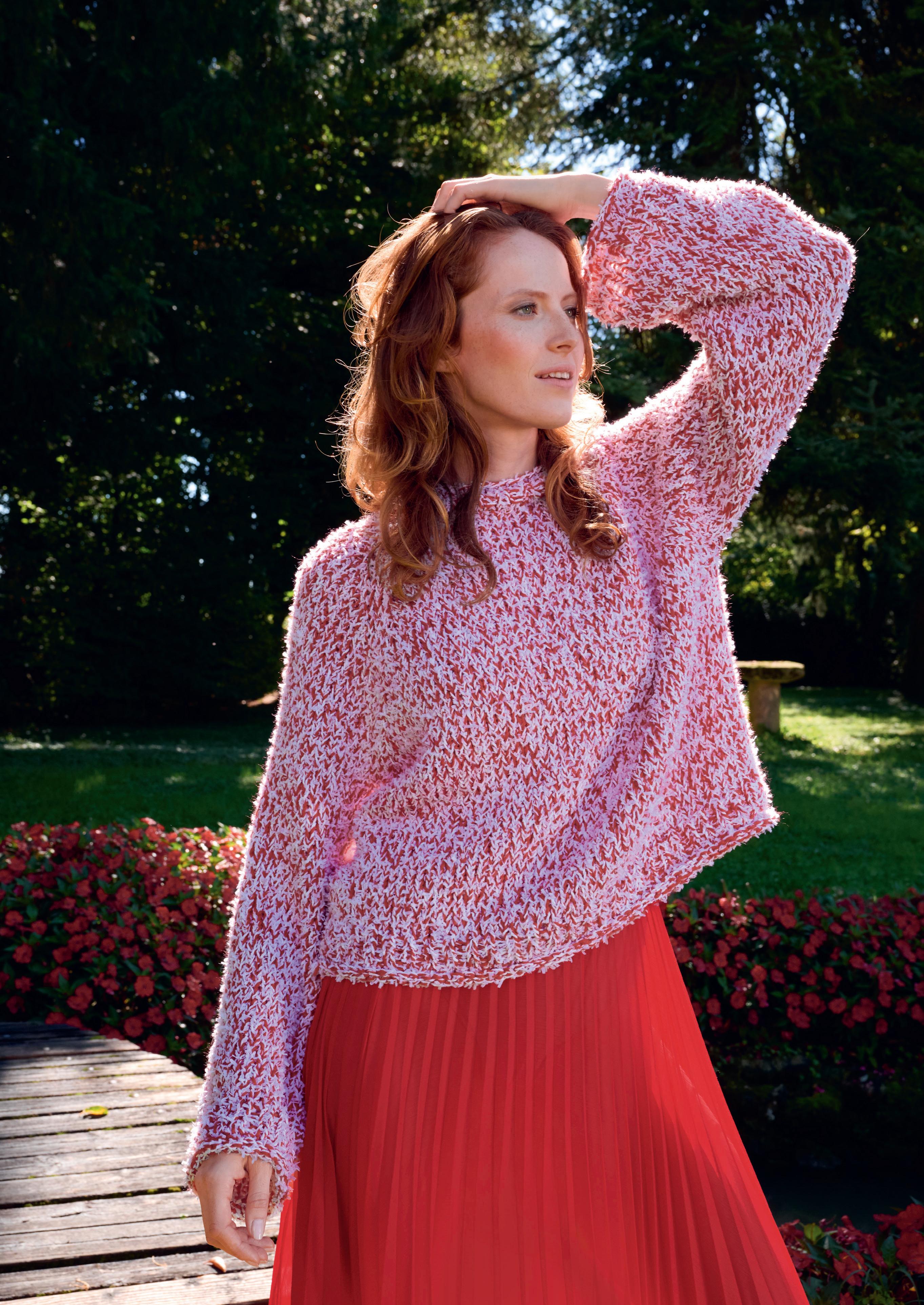 wurde nicht in Form gestrickt. Die überschnittenen Schultern und das angedeutete Schößchen entstehen – ganz einfach – durch den Einsatz dickerer Nadeln. FRIZZANT E& GLAMOUR