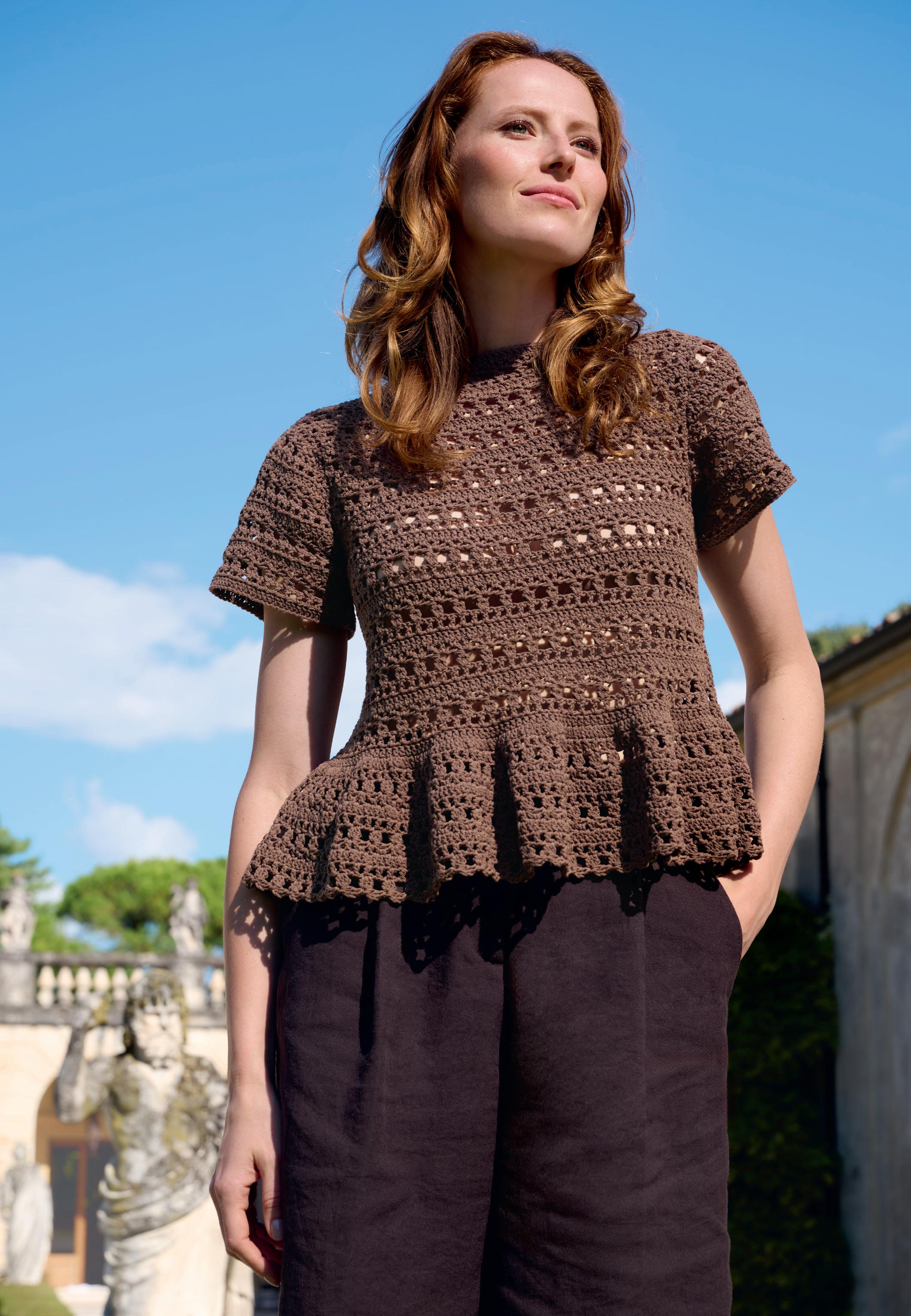 Modell 24: Trendfarbe Dunkelbraun taucht diesen PULLOVER in ein warmes, magisches Licht. Feminines Finale: das voluminöse Schößchen, das erst zum Schluss angehäkelt wird. GIOIA