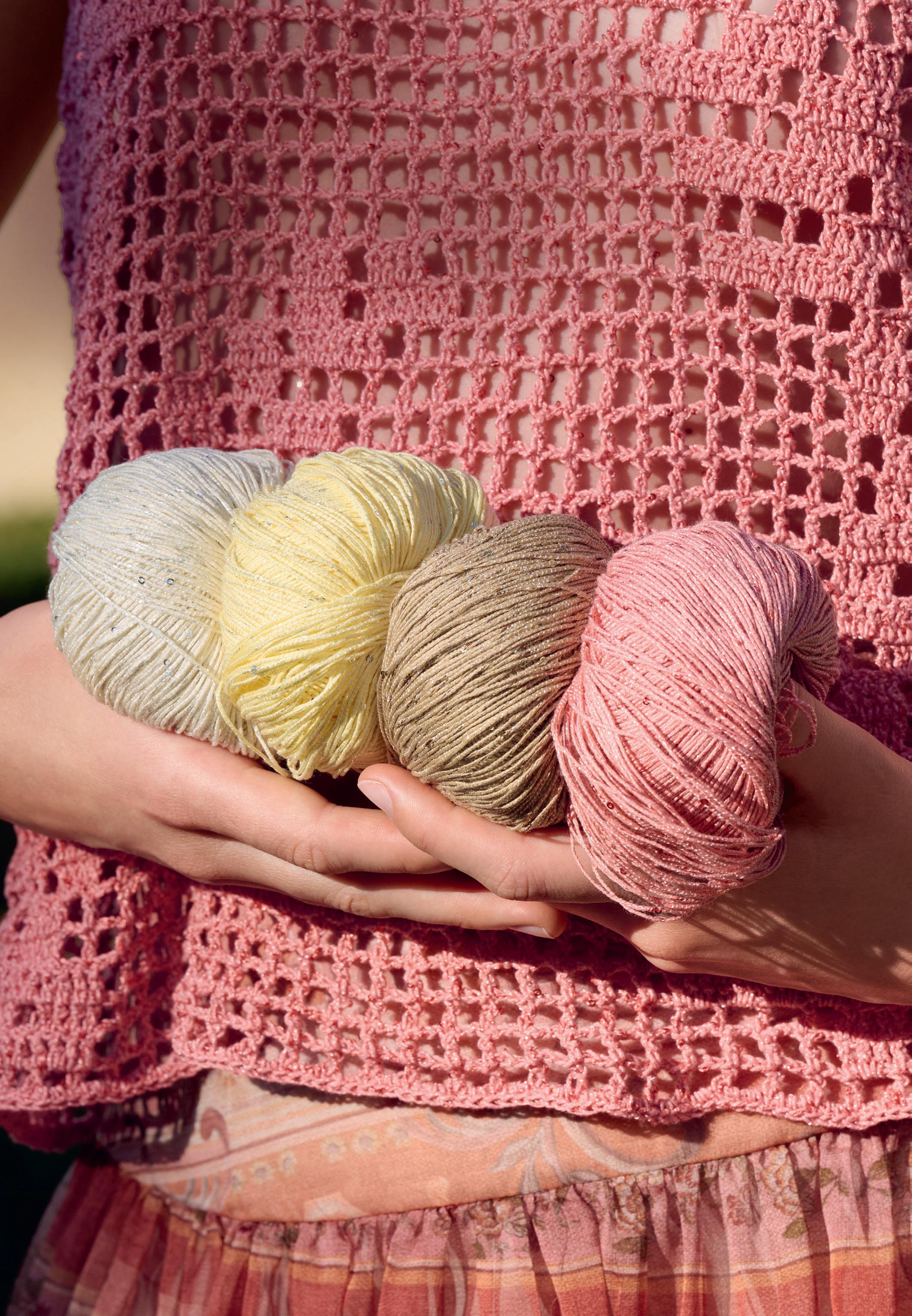 Für unsere Garnneuheit wurden zahlreiche, feinste Baumwollfäden fest miteinander verzwirnt. Dazu gesellt sich farbharmonischer Lurex, der unregelmäßige Highlights zaubert.