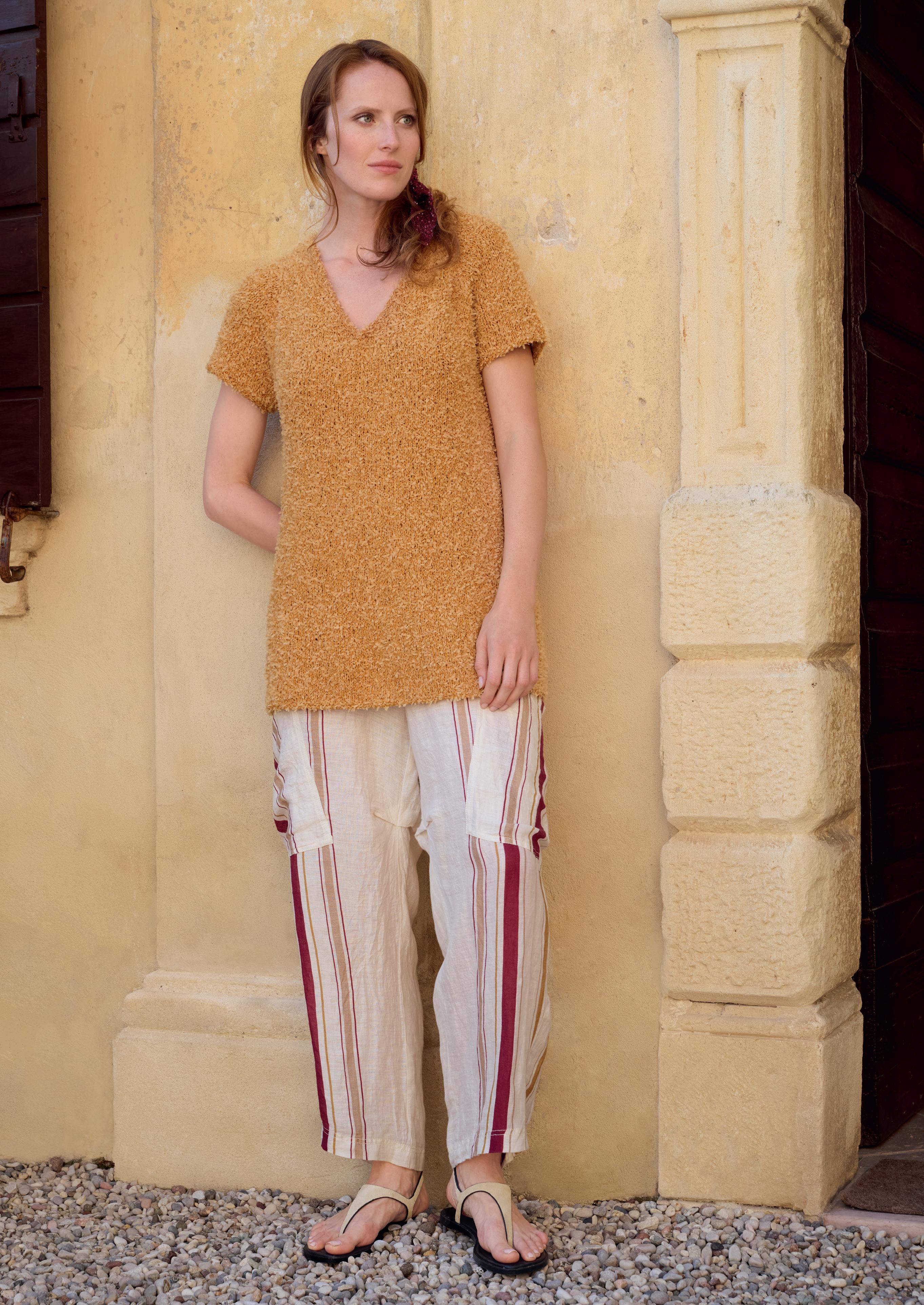 Die ockergelbe Top-Down-TUNIKA wird glatt rechts gestrickt, hat komfortable Raglanärmel und eine schmeichelnde A-Silhouette. Die lebhafte Struktur entsteht durch Garnneuheit FRIZZANTE
