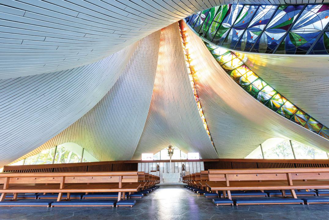 The form of the chapel itself takes inspiration from the white lily, a bloom often depicted in art as the symbol for the Virgin Mary. And as one enters the cozy space and gazes upward, you’ll see the ceiling and roof unfold into delicate “petals.”