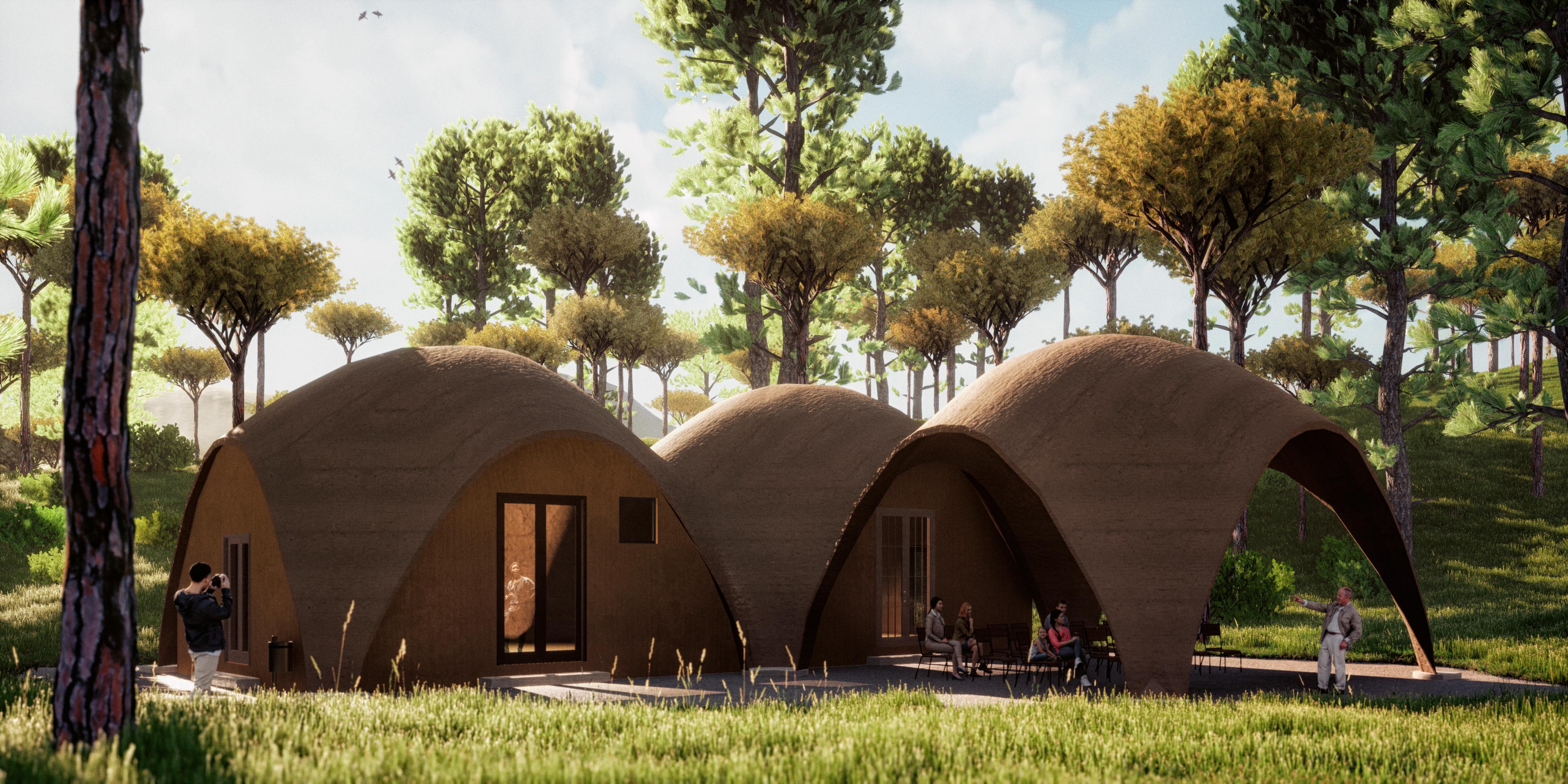 VOÛTES: Formes modulaires, construites sur place. Chaque pavillon est construit d’environ 35’000 briques (une marge de +5% inclu) en terre crue.