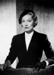 Vergebliche Domestizierung Ihr und von Sternberg bleibt nur ein kurzes Zeitfenster, bevor 1934 der Production Code, die Selbstkontrolle der Filmbranche, in Kraft tritt und Hollywoodproduktionen sittenstrenger, konservativer werden. Dietrichs Amoral, so vergnüglich sie in Ernst Lubitschs Angel auch sein mag, lässt sie zum Kassengift werden. Nun muss sie ihr Image schleunigst amerikanisieren. In der Westernkomödie Destry Rides Again (1939) gelingt ihr das mit rustikalem Elan. Als Saloonsängerin und Gangsterbraut ist sie die heimliche Herrscherin der Stadt, stellt aber ihren bisherigen Rollentyp auf den Kopf. Die Hasenpfote im Strumpfband verrät eine gewisse Treuherzigkeit, und am Ende entdeckt sie, dass sie ein Herz aus Gold hat. Der vermeintlich unbedarfte James Stewart bietet ihr derweil wenig Angriffsfläche und zähmt sie nach allen Regeln des Slapstick. Als Findelmutter in The Lady Is Willing (1942) lässt sie sich drei Jahre später mit Verve auf die eminent amerikanischen Konventionen der Screwball Comedy ein und zieht dabei jedoch das Dialogtempo beträchtlich an. Die USA adoptieren sie auch abseits der Leinwand, als sie sich während des Zweiten Weltkriegs unermüdlich in der Truppenbetreuung engagiert. Sie reist durch das Land, um Kriegsanleihen zu verkaufen, und unterhält GIs in Fronttheatern an europäischen und nordafrikanischen Kriegsschauplätzen. Hier kommt eine andere Tugend ihrer Herkunftswelt zum Tragen: ihr preussisches Pflichtgefühl. Dieses zeigt sich bereits in ihrem Arbeitsethos der Unermüdlichkeit und der Geduld: Sie verzichtet in ihren Filmen auf ein Stand-in und fungiert als ihr eigenes Lichtdouble. Dem spielt nun die private Legende der loyalen Gefährtin zu, die sich fürsorglich um Freunde, Freundinnen und Geliebte kümmert; es wird später die heimliche Grundierung ihrer Rolle in Witness for the Prosecution (1957) werden. Das Mischungsverhältnis zwischen Illusion und Identität wird in ihrer ersten Zusammenarbeit mit Billy Wilder, A Foreign Affair (1948), neu austariert. Darin verkörpert sie eine Nachtclubsängerin, die im zerbombten Berlin auftritt und ins Fadenkreuz der amerikanischen Besatzungsmacht gerät, da sie einst Kontakte in hohe Nazikreise unterhielt. Eine Wochenschau zeigt, wie sie Hitler einen Witz erzählt. Die Lieder, die sie in den Ruinen singt, handeln von Überlebensstolz, freilich mit einem Sarkasmus, der zwölf Jahre lang aus Deutschland verbannt war. Sie stammen von ihrem alten Weggefährten Friedrich Holländer, den die Nazis ins Exil trieben. In diesem Spagat überspringt Dietrich die verheerenden Jahre nicht, die dazwischenlagen. Sie versöhnt das Publikum nicht mit ihnen. Für die Generation meiner Eltern war sie eine Verräterin. Sie erinnerte daran, dass es zuvor ein anderes Deutschland gegeben hatte. Von dem sang sie in ihrer zweiten Karriere, in der sie ihre One-Woman-Show um die ganze Welt führte. Auch diese bestritt sie mit preussischem Verantwortungsgefühl: Sie blieb unermüdlich jene Marlene, die sie dem Publikum schuldig war.