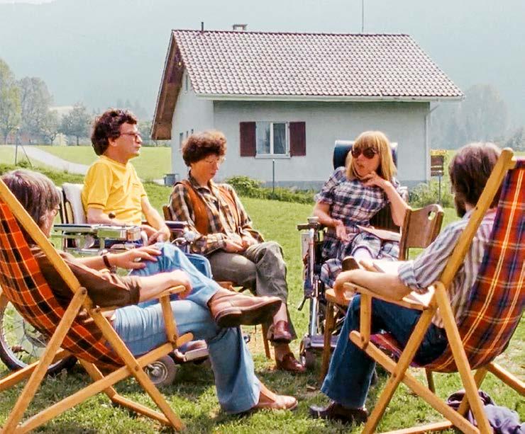 Eine Gruppe körperlich behinderter Schweizer:innen trifft sich von 1974 bis 1976 regelmässig in einem Ferienlager im Emmental und dreht über mehrere Jahre gemeinsam einen Film. Die Kamera begleitet vier Protagonist:innen (Jules Burgener, Christoph und Ursula Eggli und Therese Zemp) bei ihren Diskussionen, alltäglichen bzw. künstlerischen Aktivitäten sowohl im Ferienlager als auch in den Wohnheimen bzw. Wohngemeinschaften, wo sie leben. Die Porträts folgen jeweils der gleichen narrativen Struktur: Sie beginnen mit einer Aussage über die Sexualität im Ferienlager, gefolgt von längeren Interviews mit den Protagonist:innen, Alltagsszenen im Ferienlager und in den Heimen. Diese zeigen sowohl die Pflegearbeit als auch die kreative Arbeit und schliesslich das Scheitern bzw. das Gelingen der Gemeinschaftsbildung. (ml/ lwa)