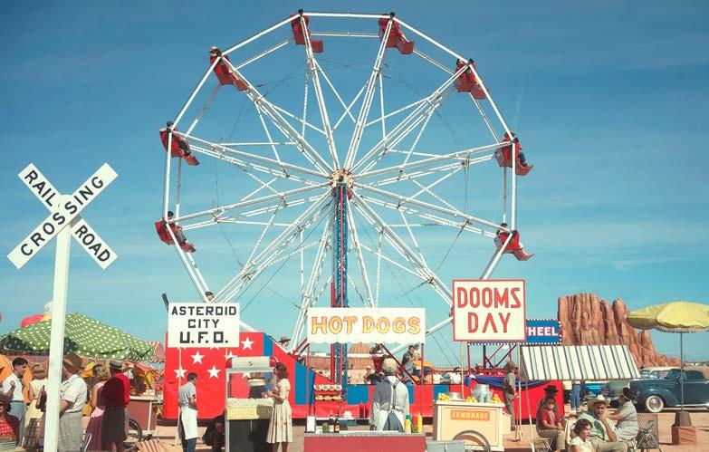 ming-of-Age-Komödie über einen jungen Theatervisionär (Jason Schwartzman), der sich in seine verwitwete Lehrerin (Olivia Williams) verliebt, zeigt einen Regisseur mit Interesse an Selbstreflexion und am Hinterfragen gesellschaftlicher Normen. Doch über die Jahrzehnte haben sich Tonalität und Thematik von Andersons Werken konsequent verdunkelt. Zunehmend finden sich Schattierungen und Graustufen in der filmischen Textur. Als in Isle of Dogs eine Hundegrippe ausbricht, nutzt ein korrupter Bürgermeister die rasch um sich greifende Epidemie, um von den eigenen politischen Problemen abzulenken. Kurzum werden alle Vierbeiner auf eine riesige Mülldeponie verbannt. Umweltverschmutzung, Klimakrise, Rechtsruck, all das ist mit lakonischer Ironie in dieser klugen Fabel angelegt. Ähnlich komplexe und bedrohliche Gedankenwelten tun sich auf, wenn man einen Blick hinter die Kulissen einer exzentrischen Utopie in Pastell wie Asteroid City wirft. Dann wird deutlich: Die schleichende Gefahr durch den Autoritarismus ist dem Regisseur besonders unheimlich. Lieber erträumt sich Anderson deshalb die ihn umgebende düstere Realität mit Atomtests und Aliens, wie er sie sich vorstellt, wenn Künstler wie er die Wirklichkeit malen könnten, wie sie ihnen gefällt.