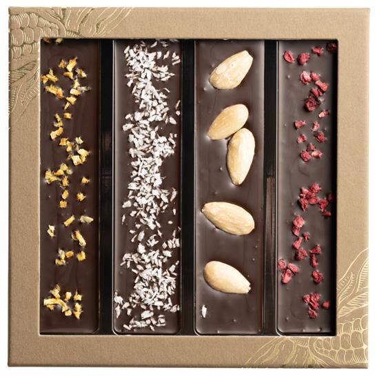 4 STK. REN CHOKOLADESTÆNGER, A Hvid chokolade m/ knas, mælkechokolade m/karamel og salt, mørk chokolade m/havtorn, mørk chokolade m/ mandler.