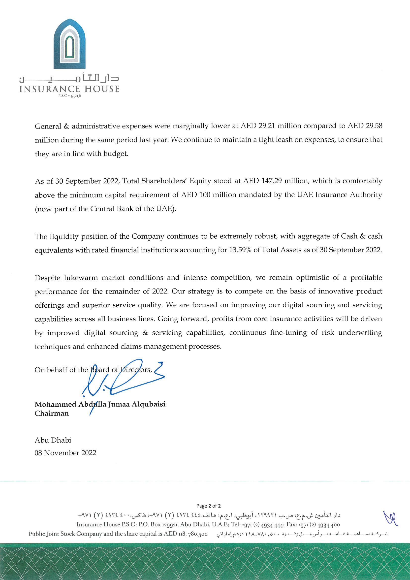 We have reviewed the accompanying unaudited condensed interim statement of financial position of Insurance House P.J.S.C. (the “Company”) as at 30 September 2022 and the related unaudited condensed interim statement of profit or loss and other comprehensive income for the three month and nine month periods then ended and the unaudited condensed interim statement of changes in equity and the unaudited condensed interim statement of cash flows for the nine month period then ended and other explanatory notes. Management is responsible for the preparation and fair presentation of these unaudited interim condensed financial statements in accordance with International Accounting Standard 34 (“IAS 34”) ‘Interim Financial Reporting’ as issued by the International Accounting Standards Board (IASB). Our responsibility is to express a conclusion on the condensed interim financial statements based on our review.