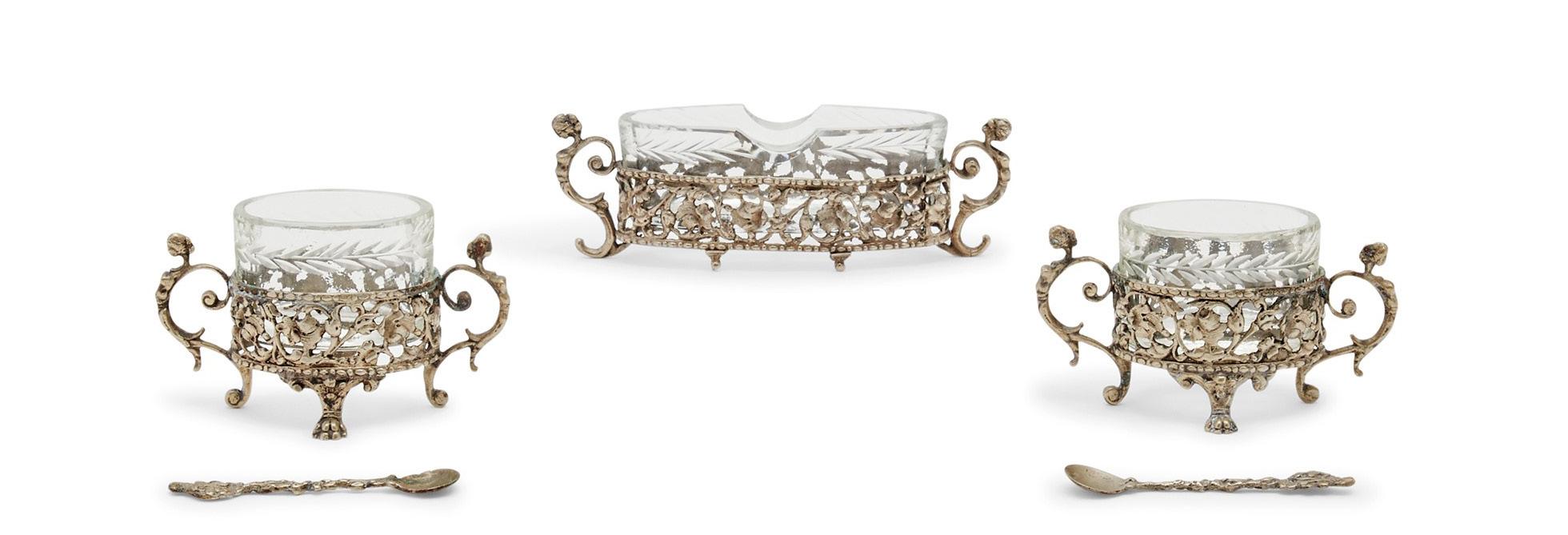 SET DA TOILETTE ARGENTO 925 E VETRI composto da tre vasi in argento e vetro dipinto e una ciotola. Peso lordo kg 1,560