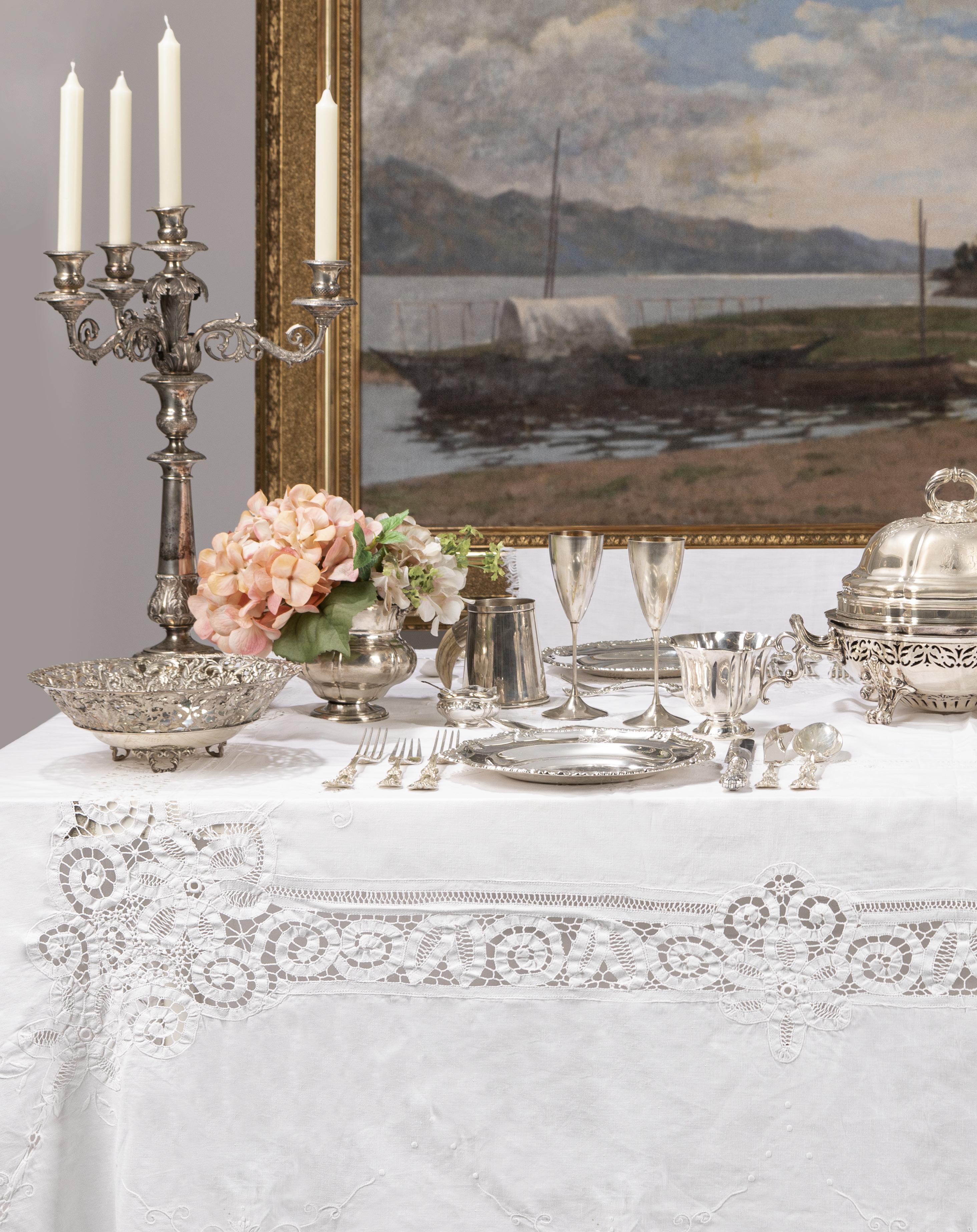 composto da 12 forchette grandi, 12 coltelli grandi, 6 cucchiai grandi, 6 forchette pesce, 6 coltelli pesce, 6 forchette piccole, 6 coltelli piccoli, 6 coltelli dessert, 6 forchette dessert e 3 serviti. Peso kg 3.200 (al netto delle lame)