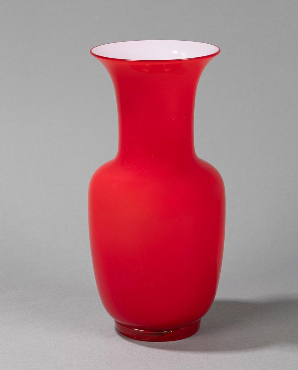 Vaso Anni Trenta 2011 in vetro soffiato rosso incamiciato bianco. Produzione Venini. Firma Venini 2011 e adesivo 90° anniversario.