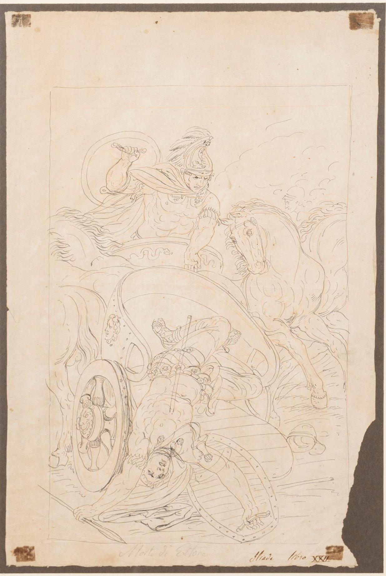 Morte di Ettore sanguigna e china su carta mm 390 x 255 intitolato in basso al centro e a sinistra: Morte di Ettore Iliade libro XXII