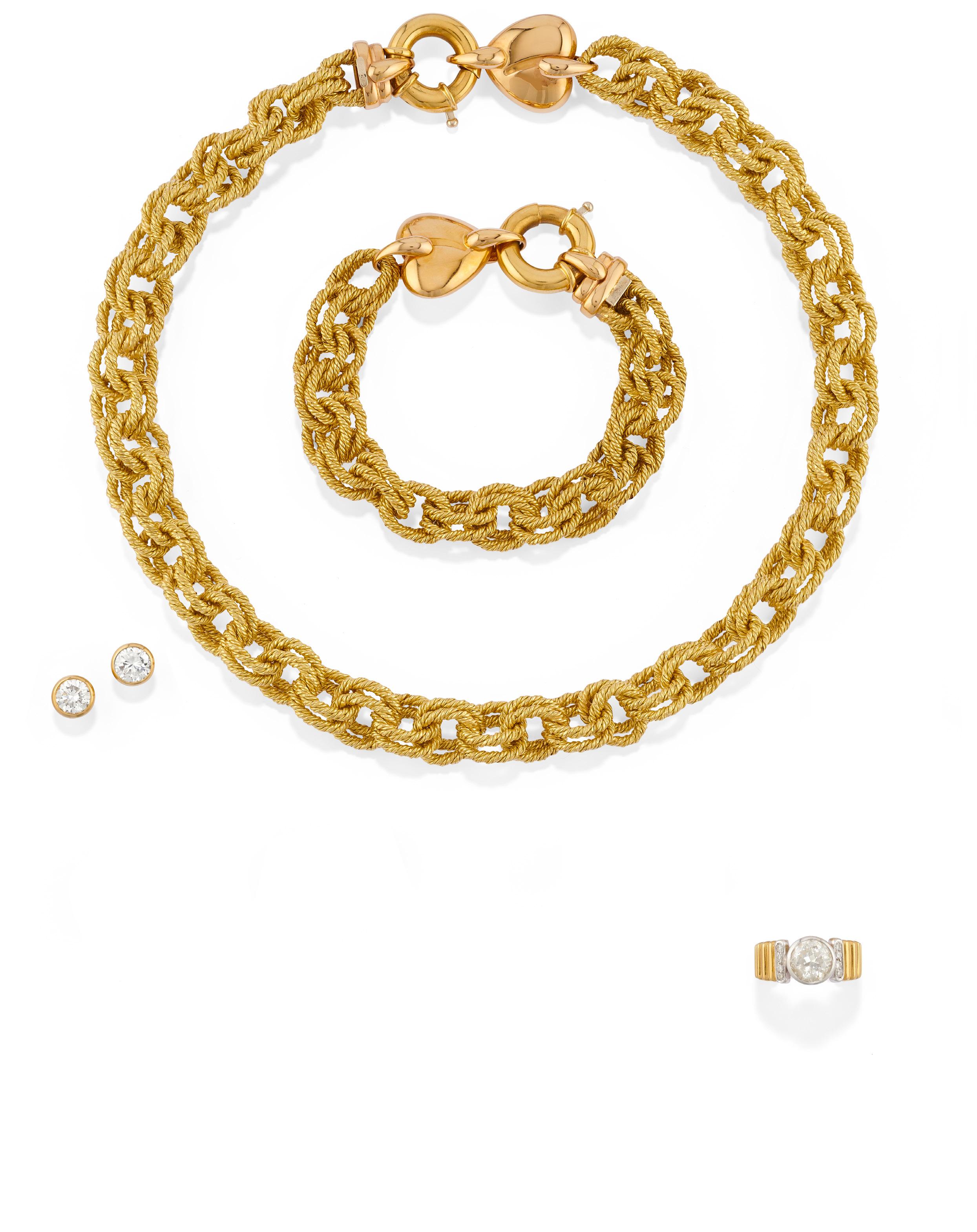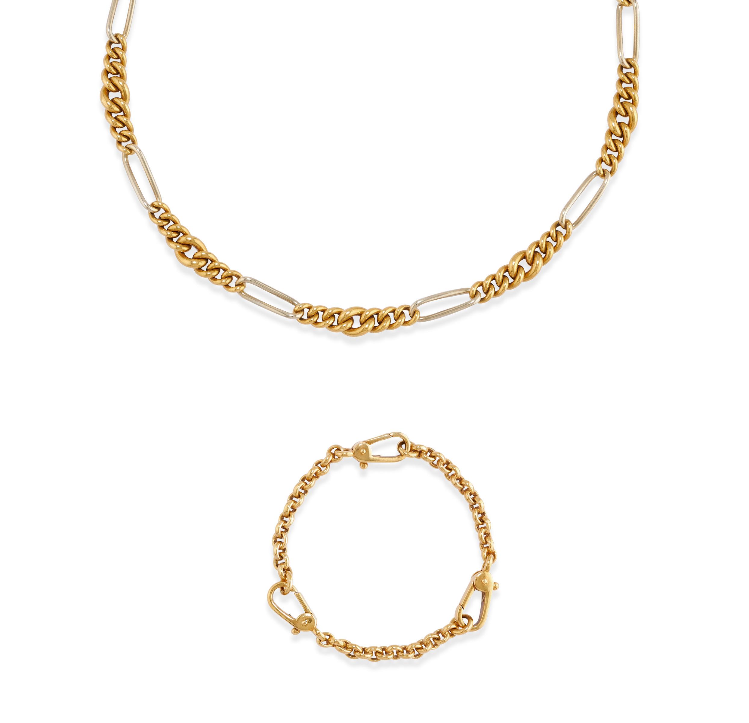 NECKLACE AND BRACELET, 18k yellow and red gold, with heart motif clasp, can be used as a single sautoire necklace.