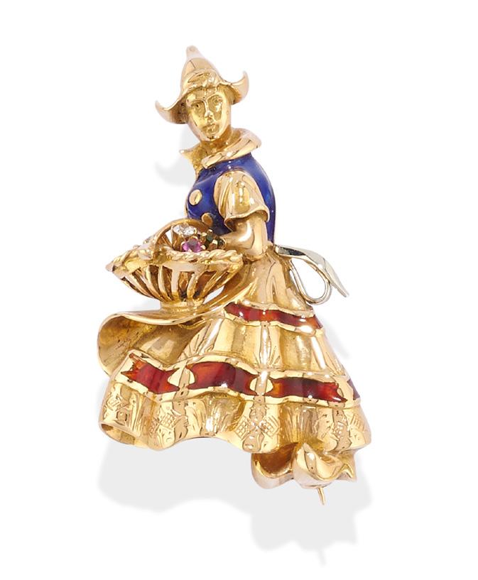 BROOCH WITH ENAMELS, 18k yellow gold, of a sidecar design, with case.