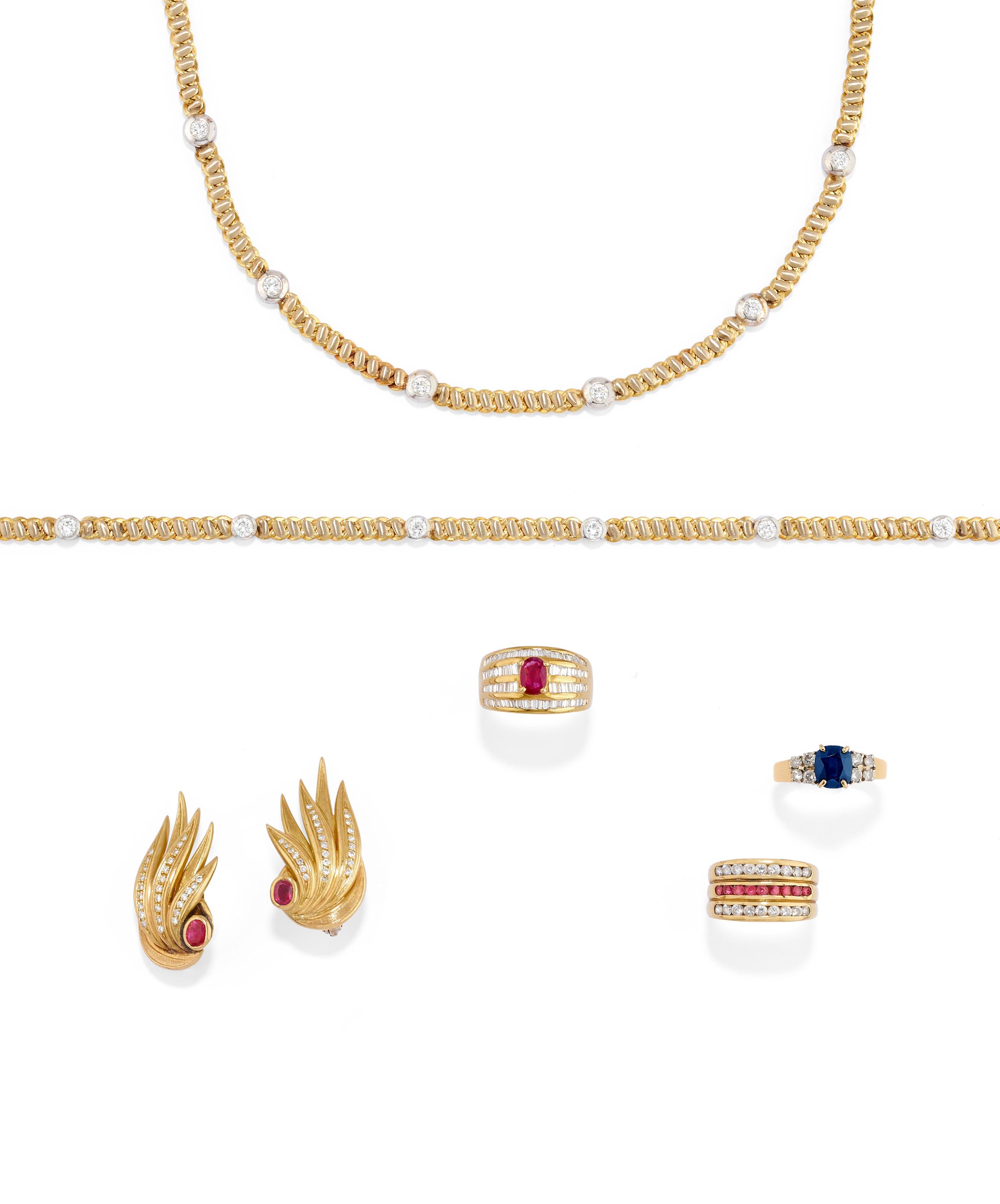 NECKLACE AND EARRINGS WITH COLORED STONES, 18k yellow gold, necklace with old and brilliant cut diamonds, oval-cut sapphire, blue topaz and citrine quartz of different cuts and shapes; earrings with blue topaz, fitted with clips.