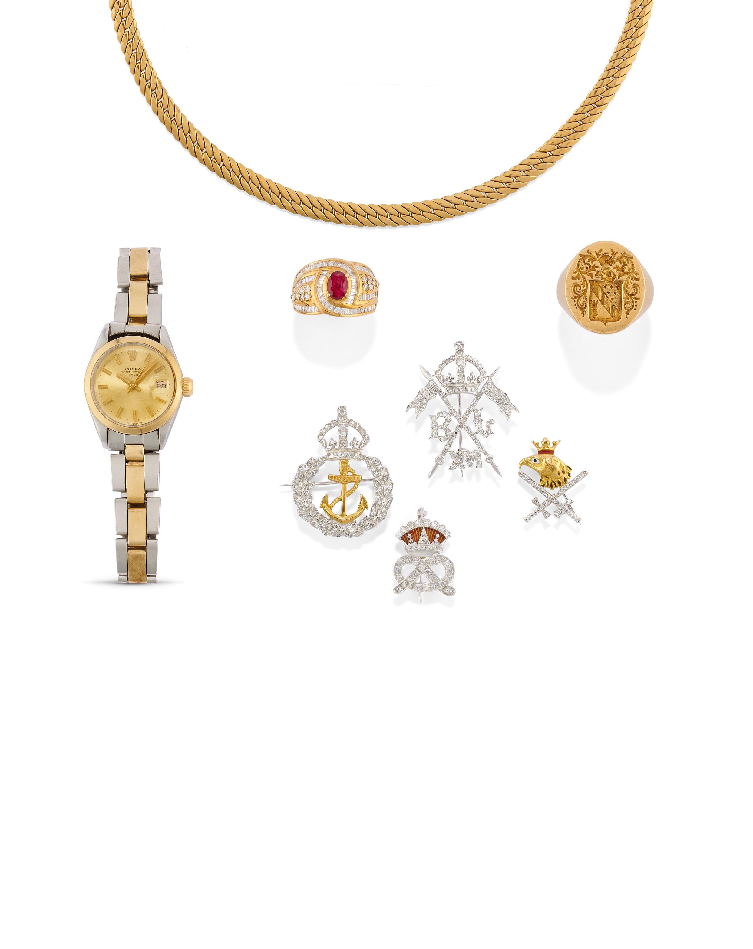 FOUR REGIMENTAL BROOCHES, 18k two-color gold, with brilliantcut diamonds and enamels.