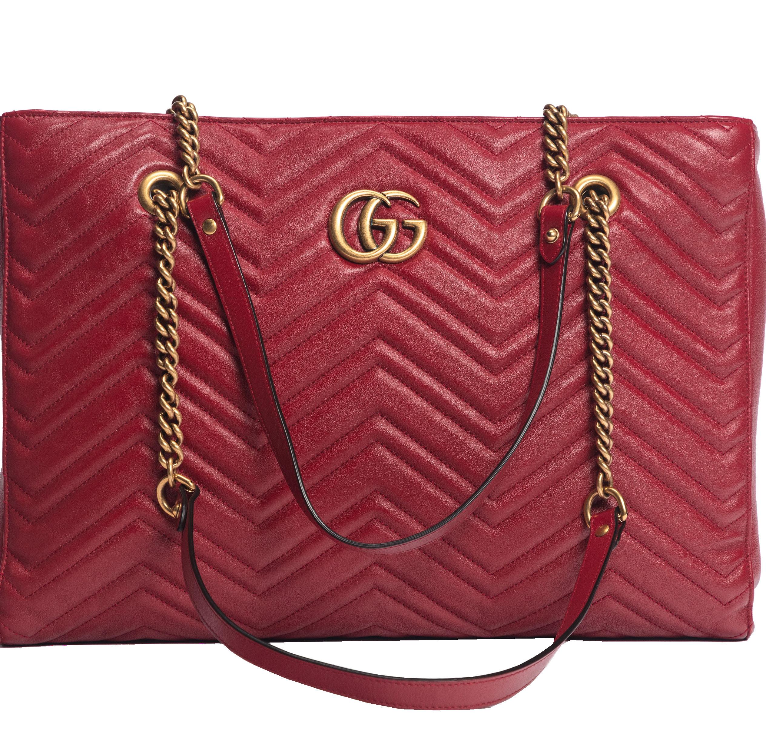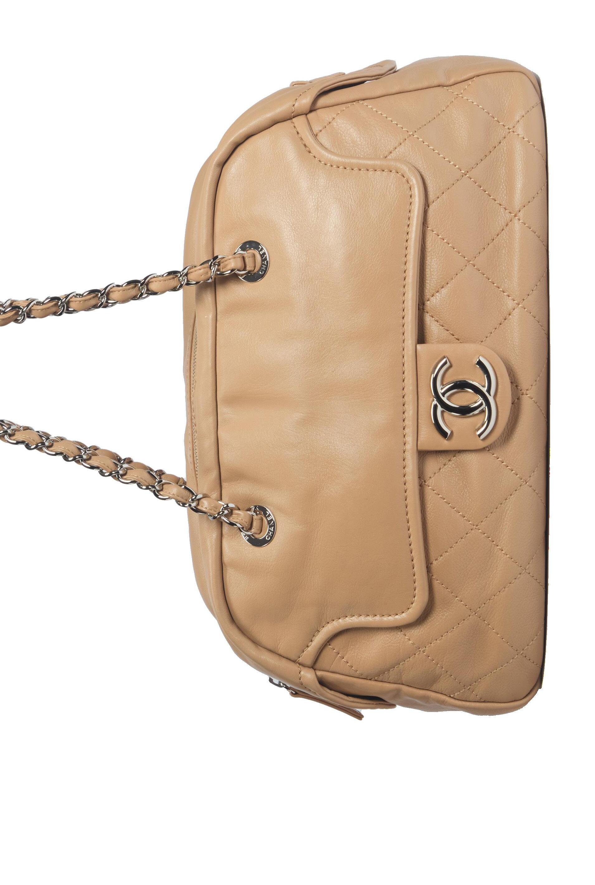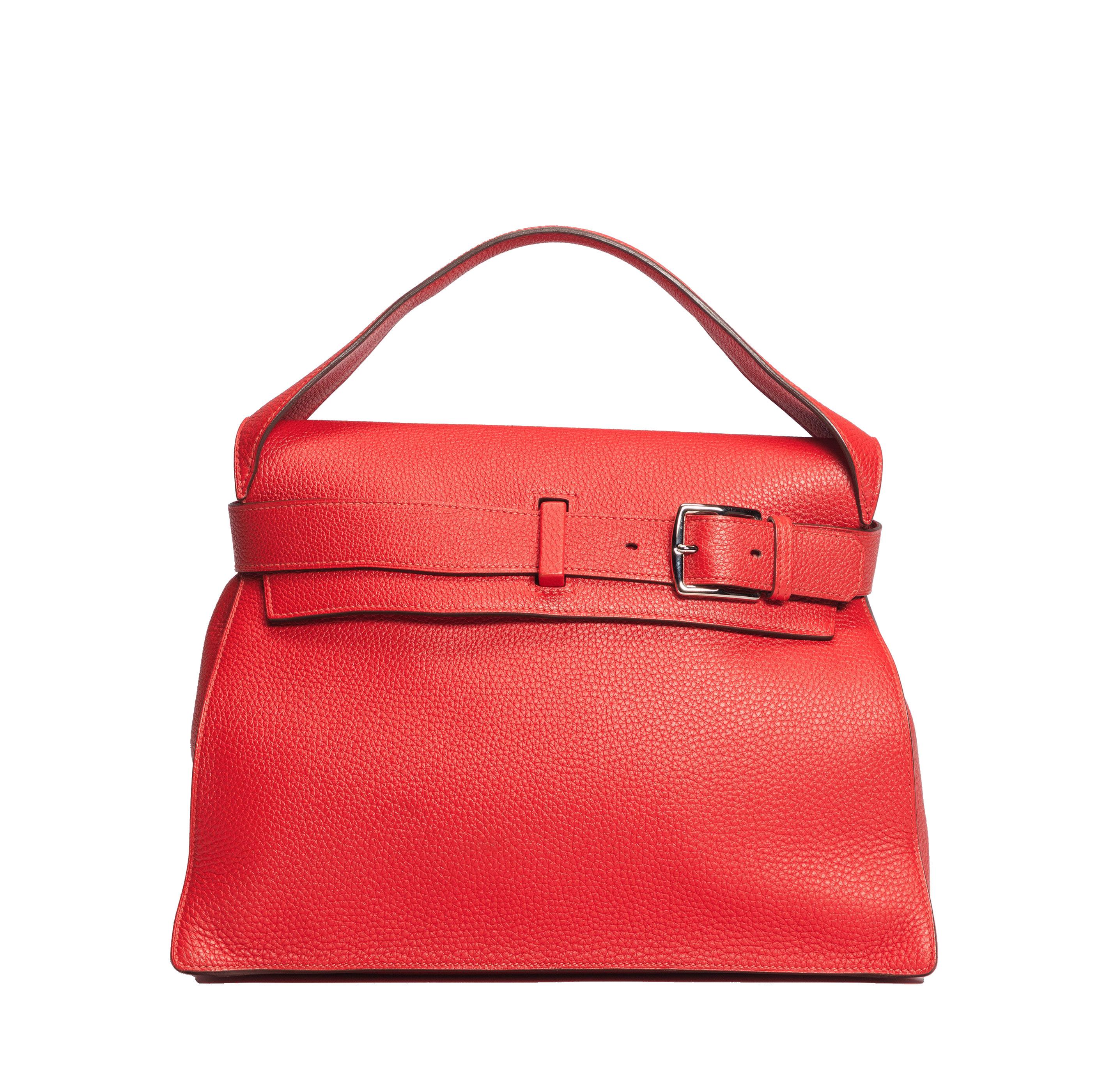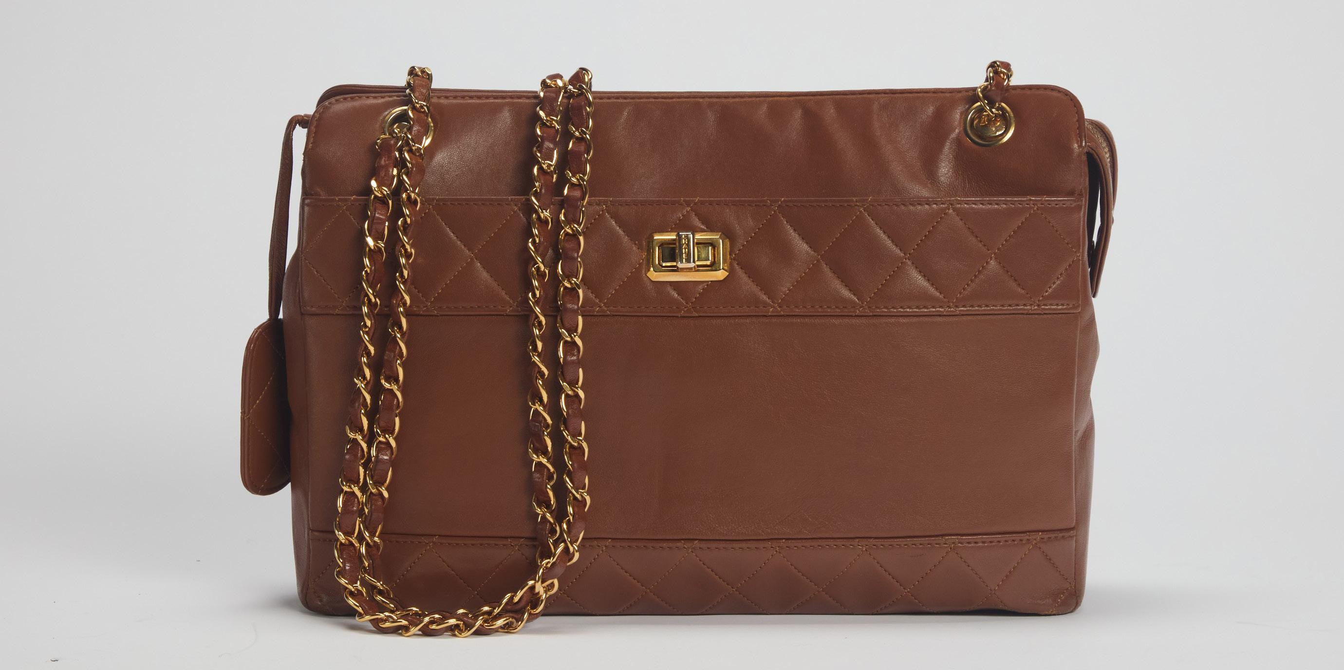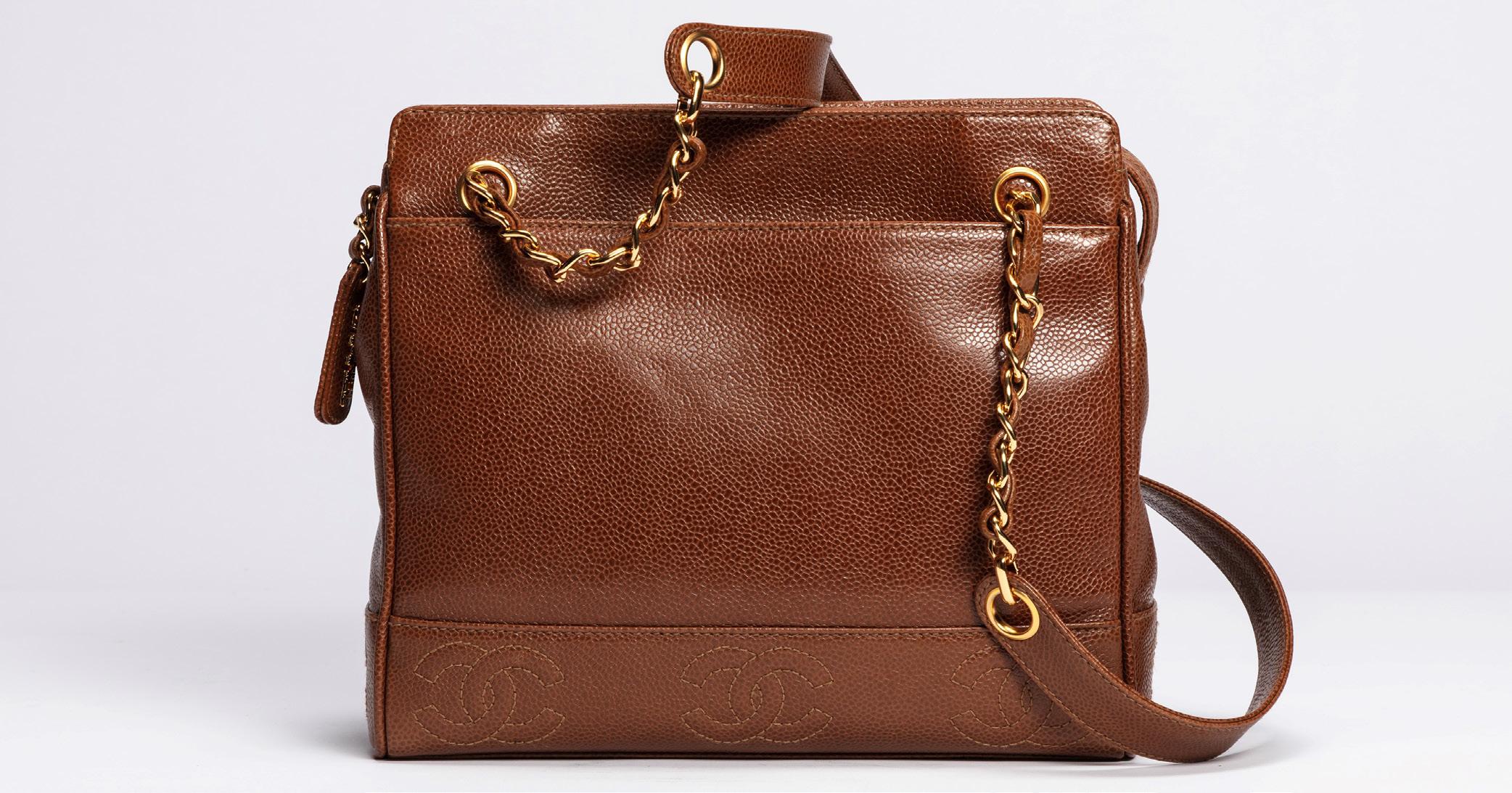 in pelle caviar color corallo, chiusura a cerniera, dettagli in metallo dorato satinato, doppia tracolla a catena, cm 35 (difetti), 2012