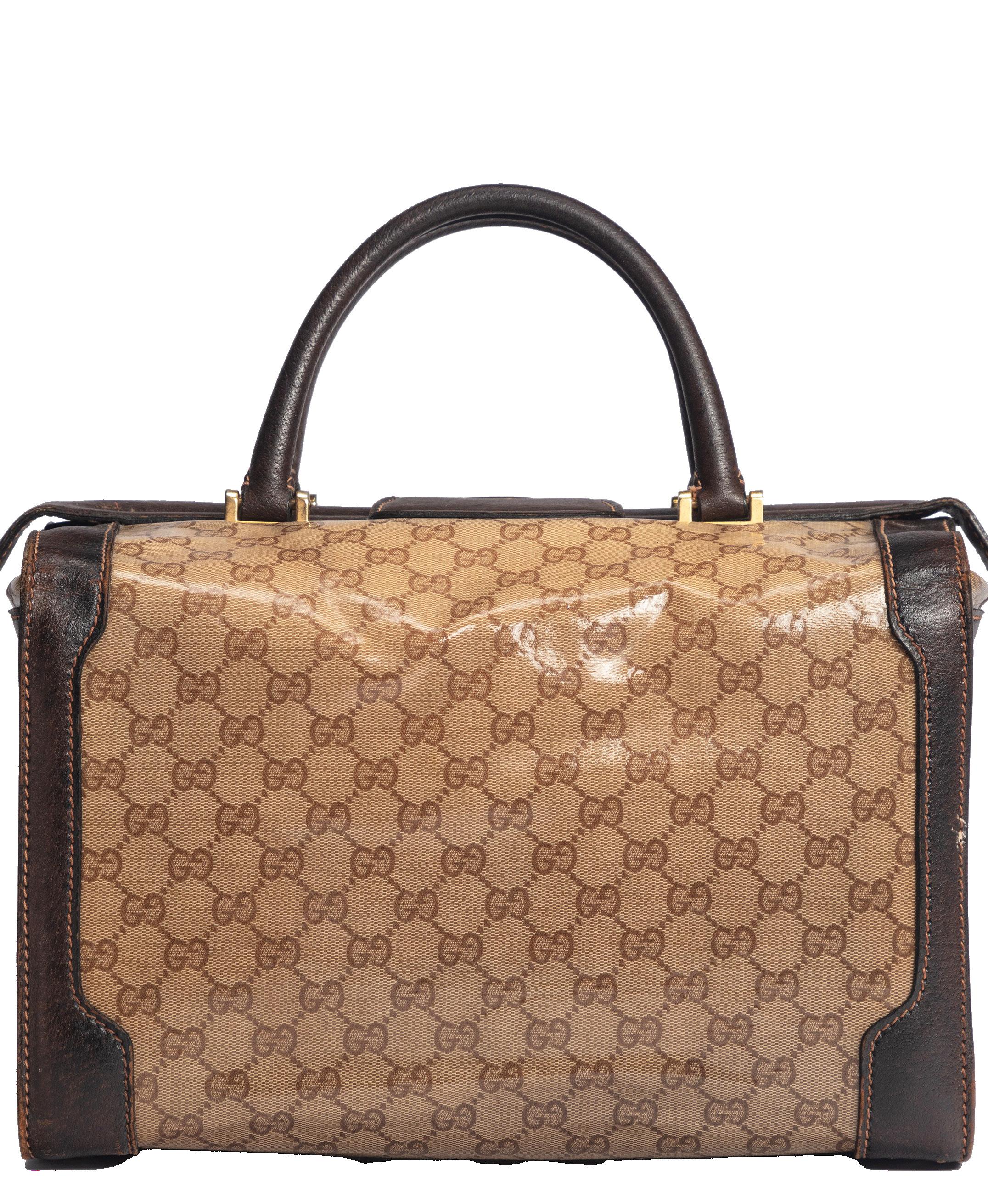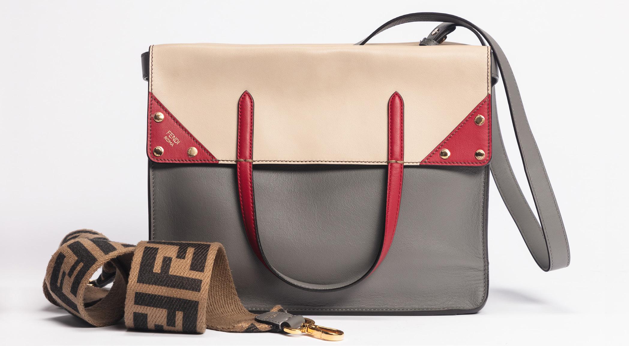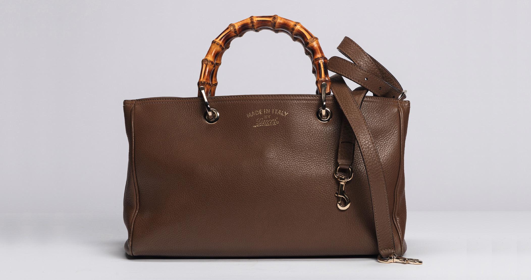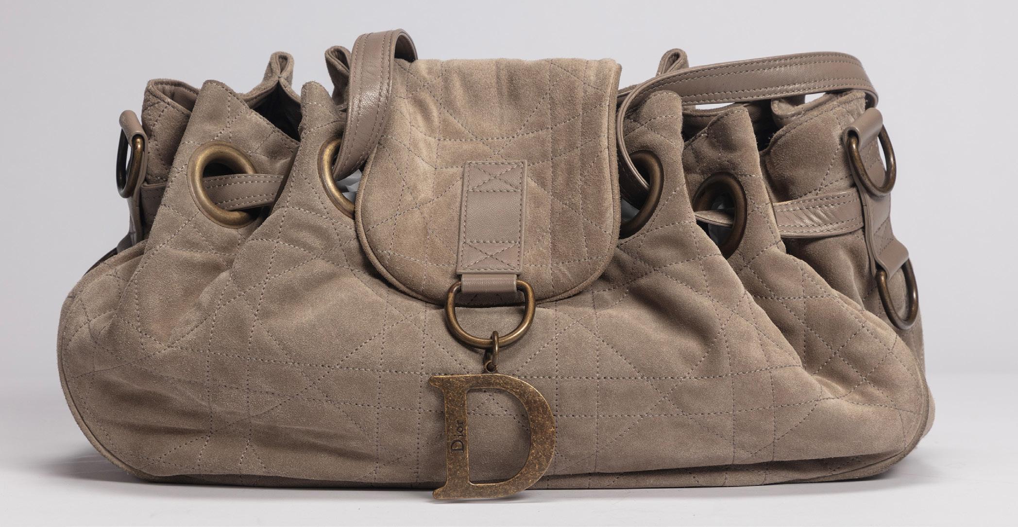 in pelle color tortora, doppia tracolla a spalla, dettagli in metallo, interno in tessuto, cm 30 (base), con sacchetto, 2009