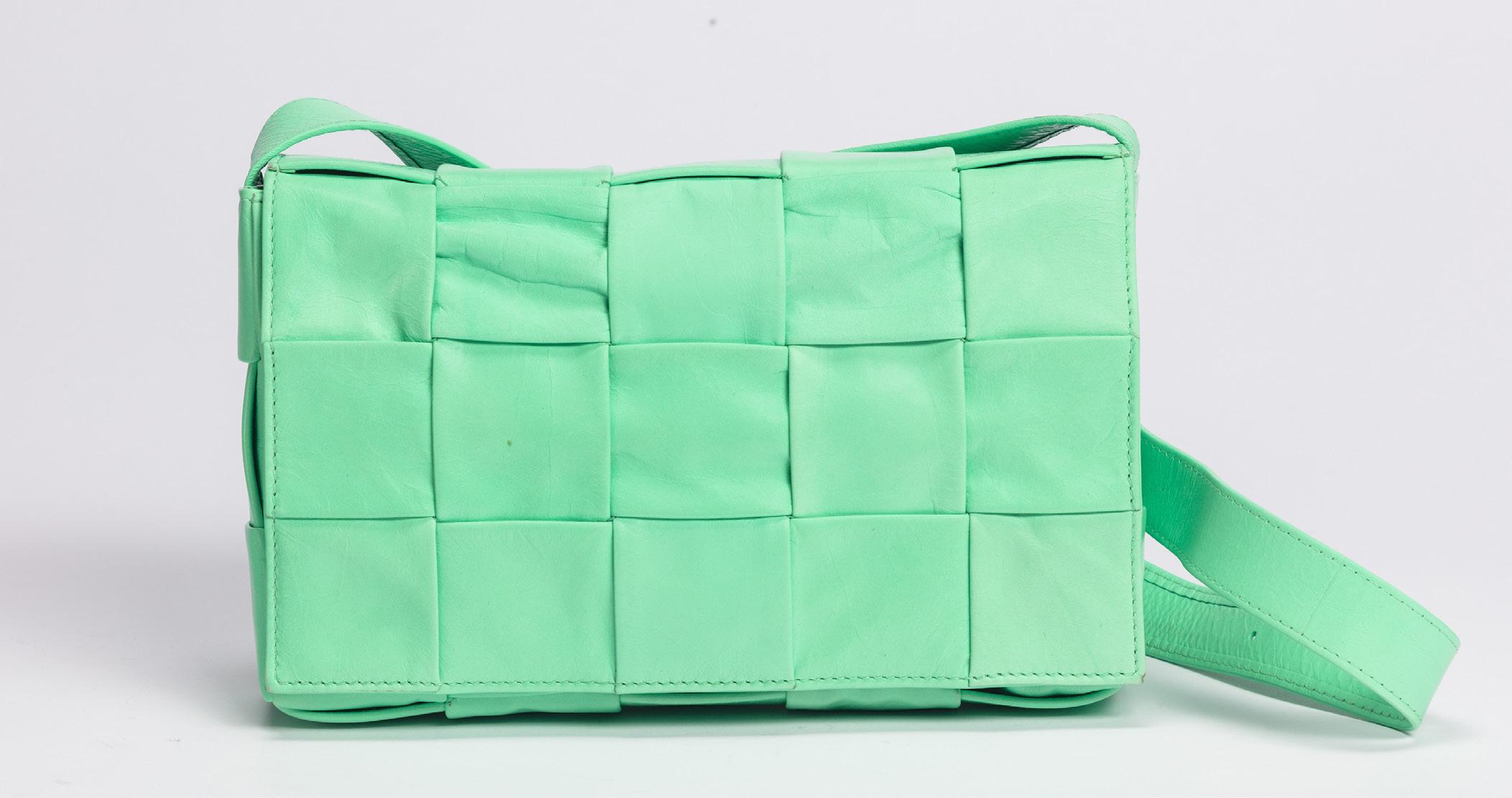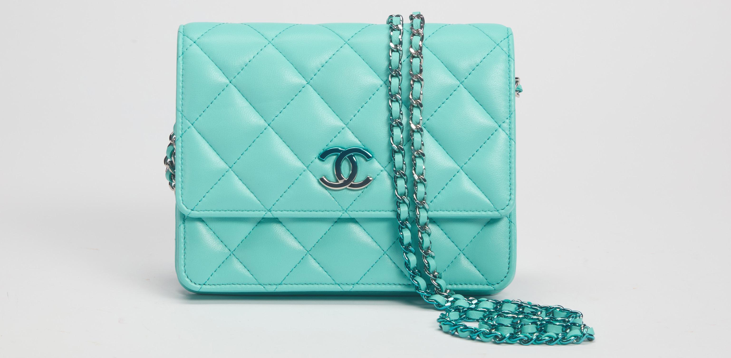 BORSA WALLET ON CHAIN in pelle matelassé color turchese, tracolla a catena, dettagli in metallo, cm 19, con sacchetto, 2024