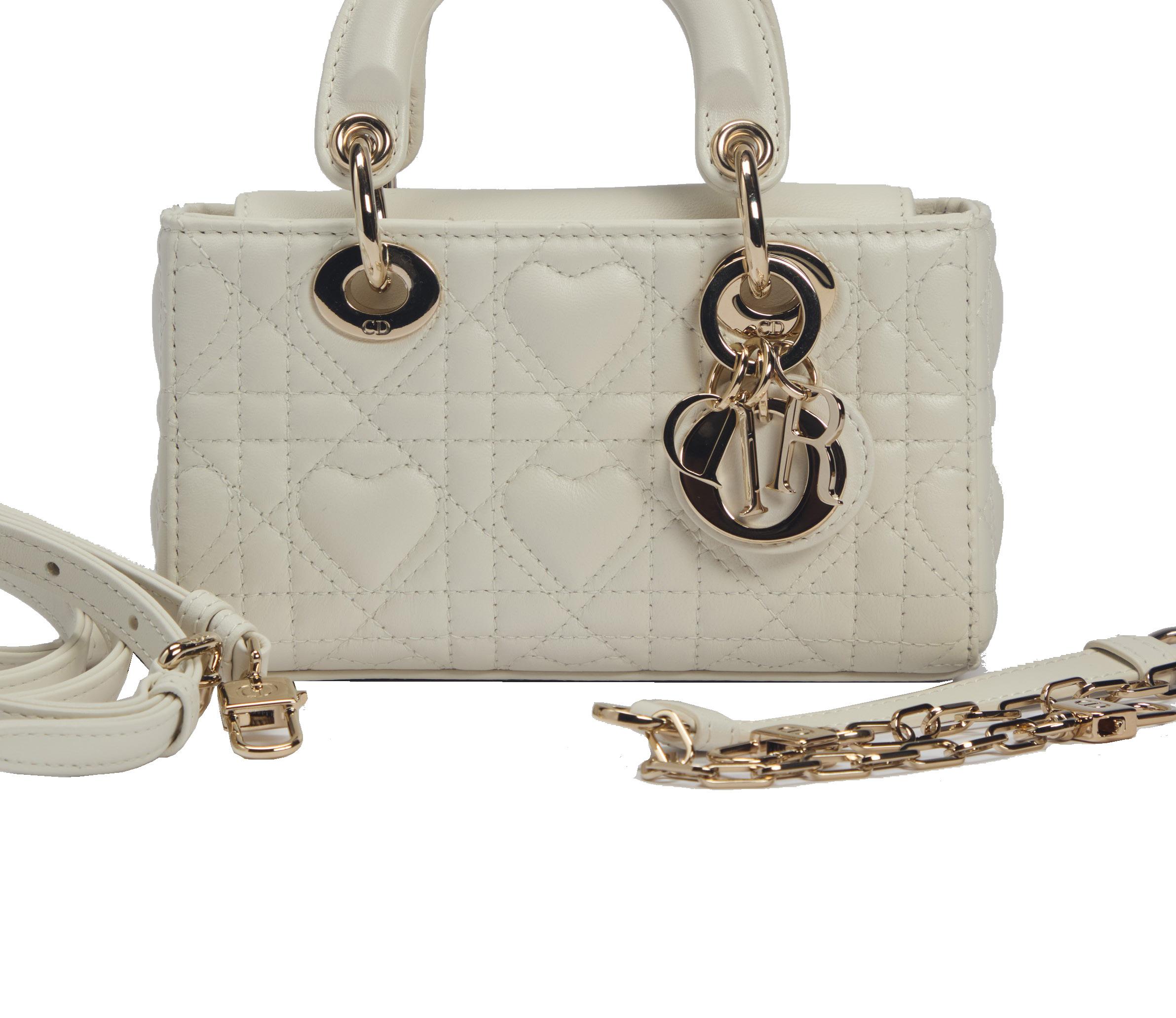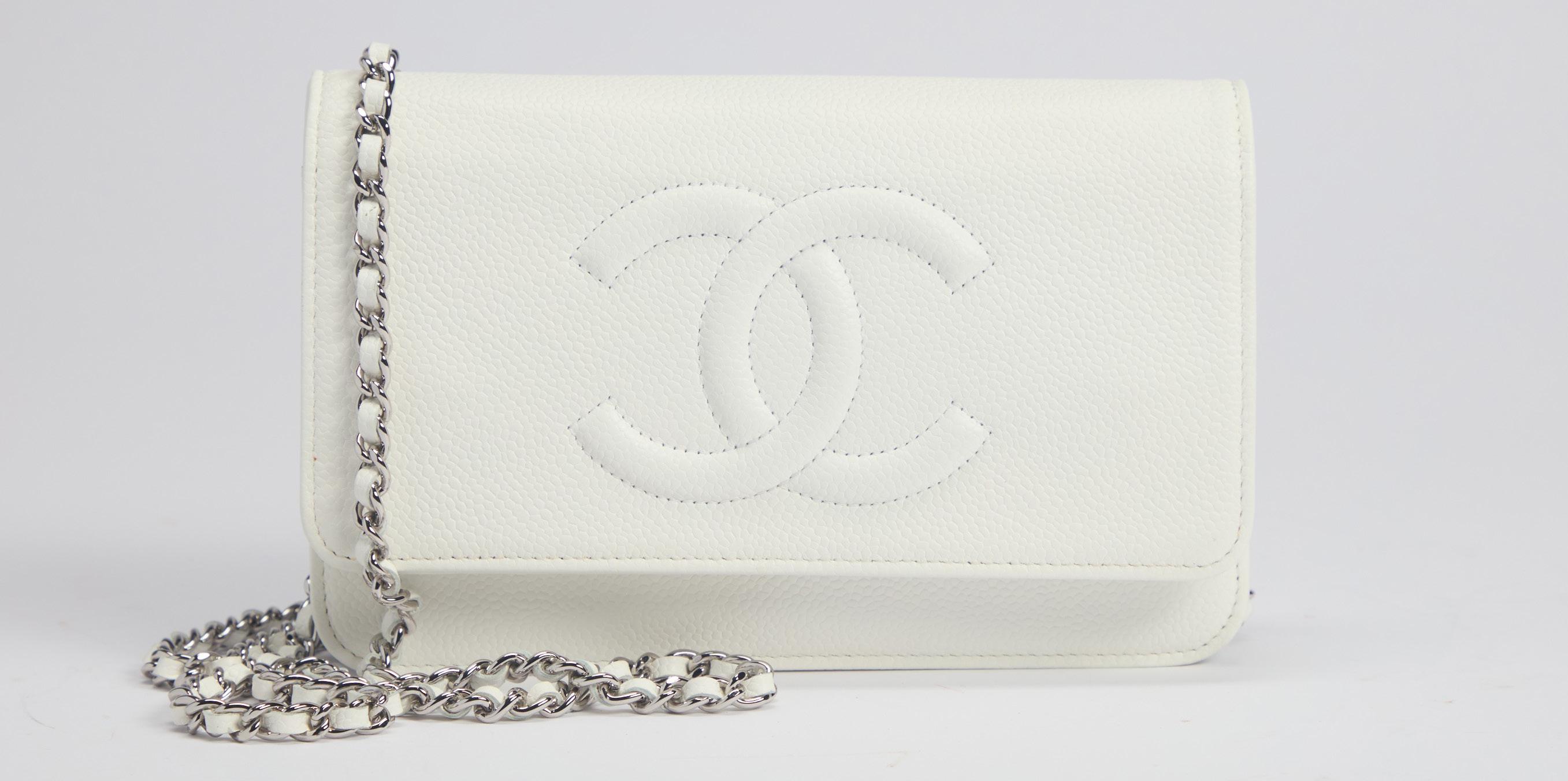 BORSA WALLET ON CHAIN in pelle caviar color bianco, dettagli in metallo, tracolla a catena, cm 19, con sacchetto (lievissimi difetti), 2010