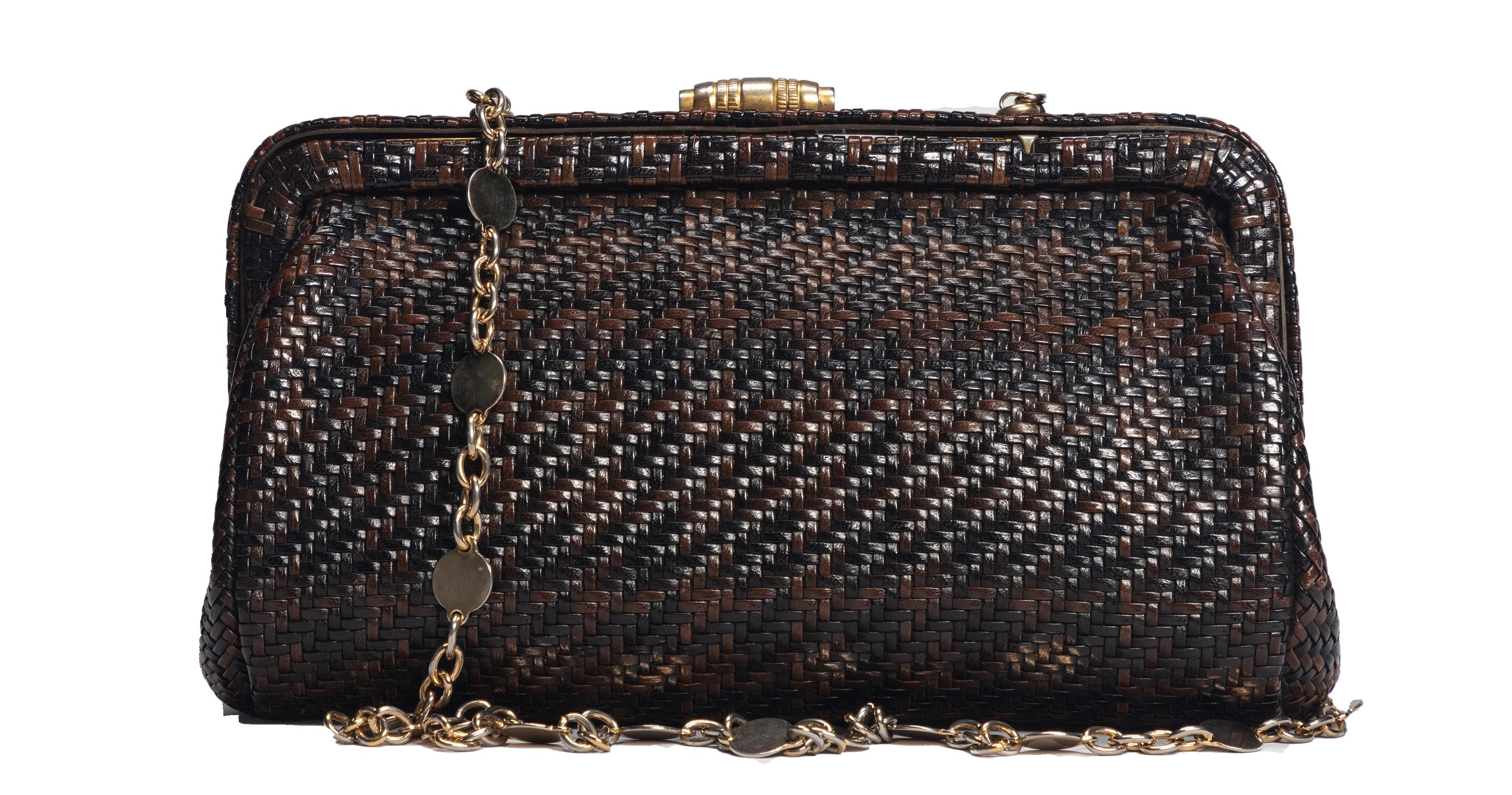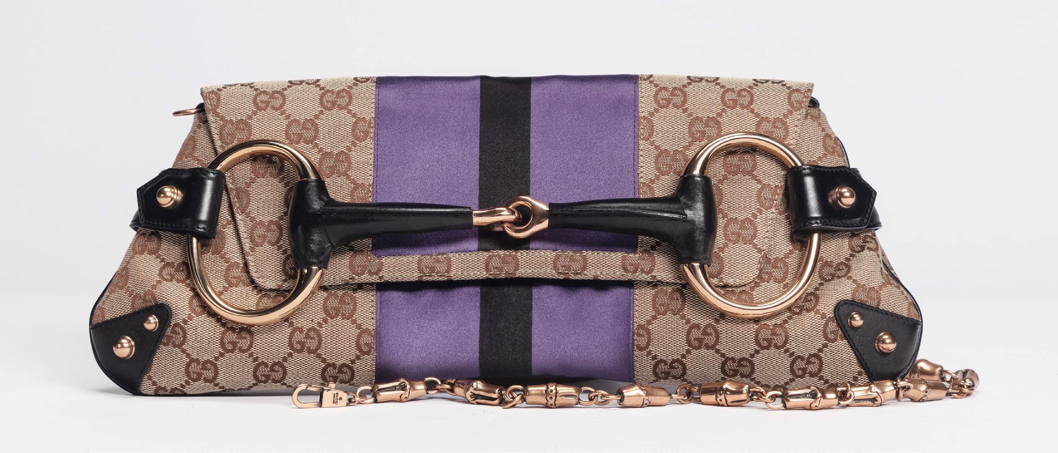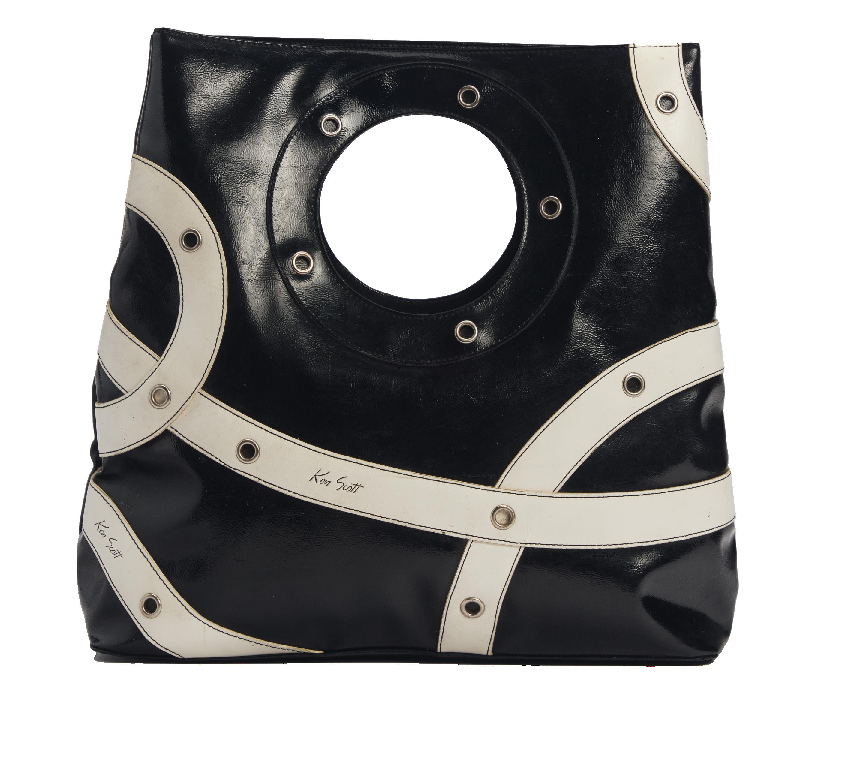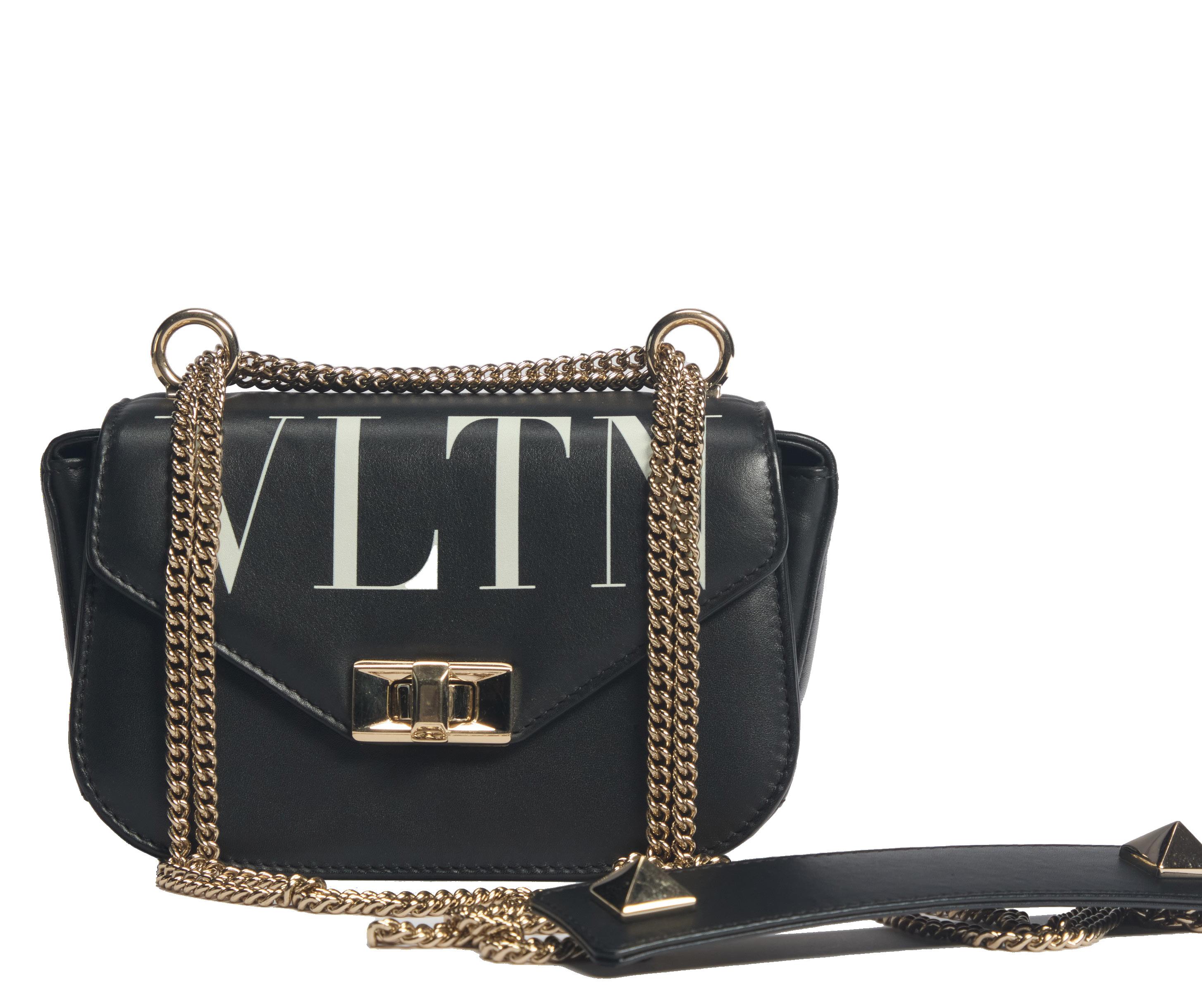 in pvc logato e pelle, pouch interno staccabile, tracolla con inserti a catena in metallo, dm cm 15 (lievissimi difetti), 2018