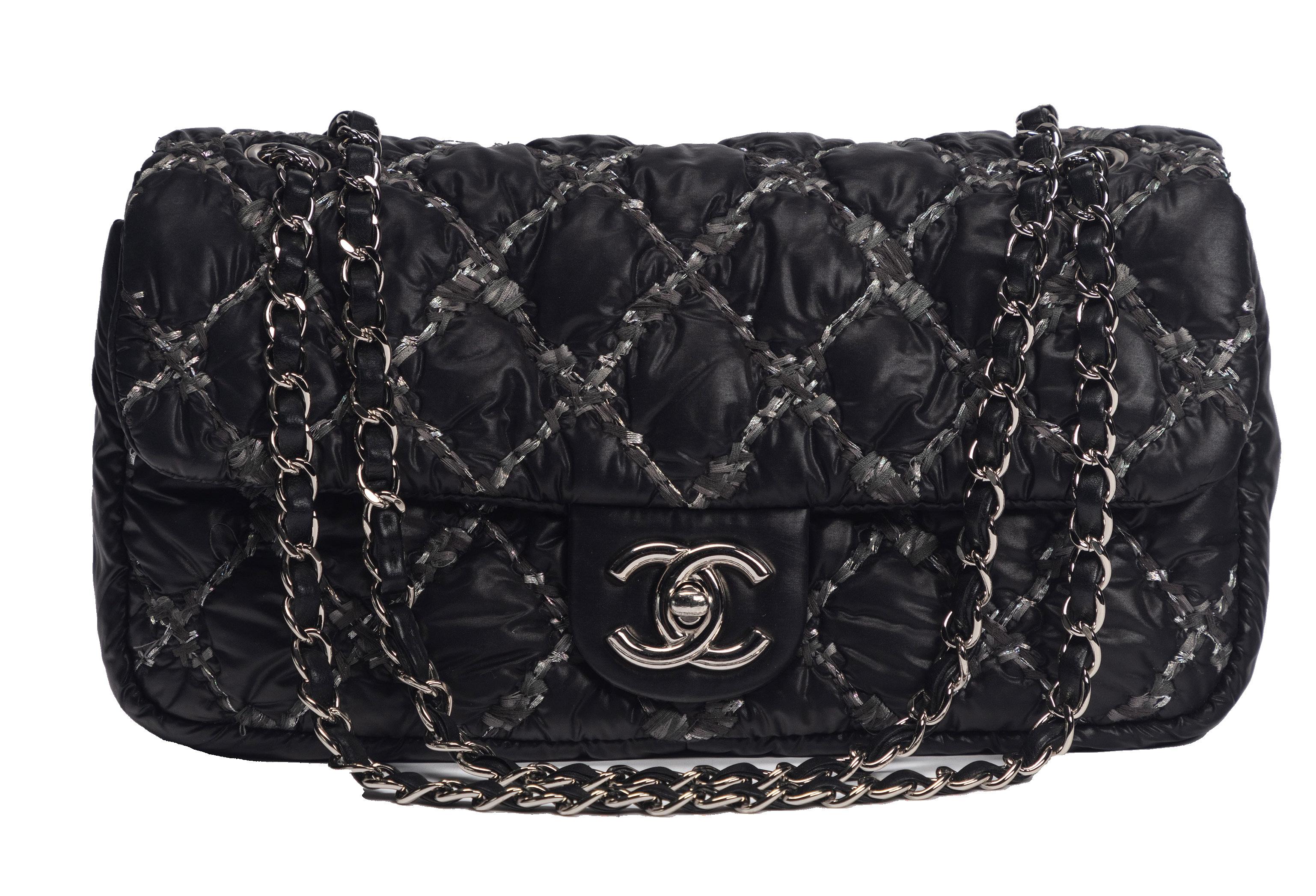 in tessuto tecnico trapuntato color nero, dettagli in metallo e pelle, tracolla a catena, cm 27, con scatola, 2010