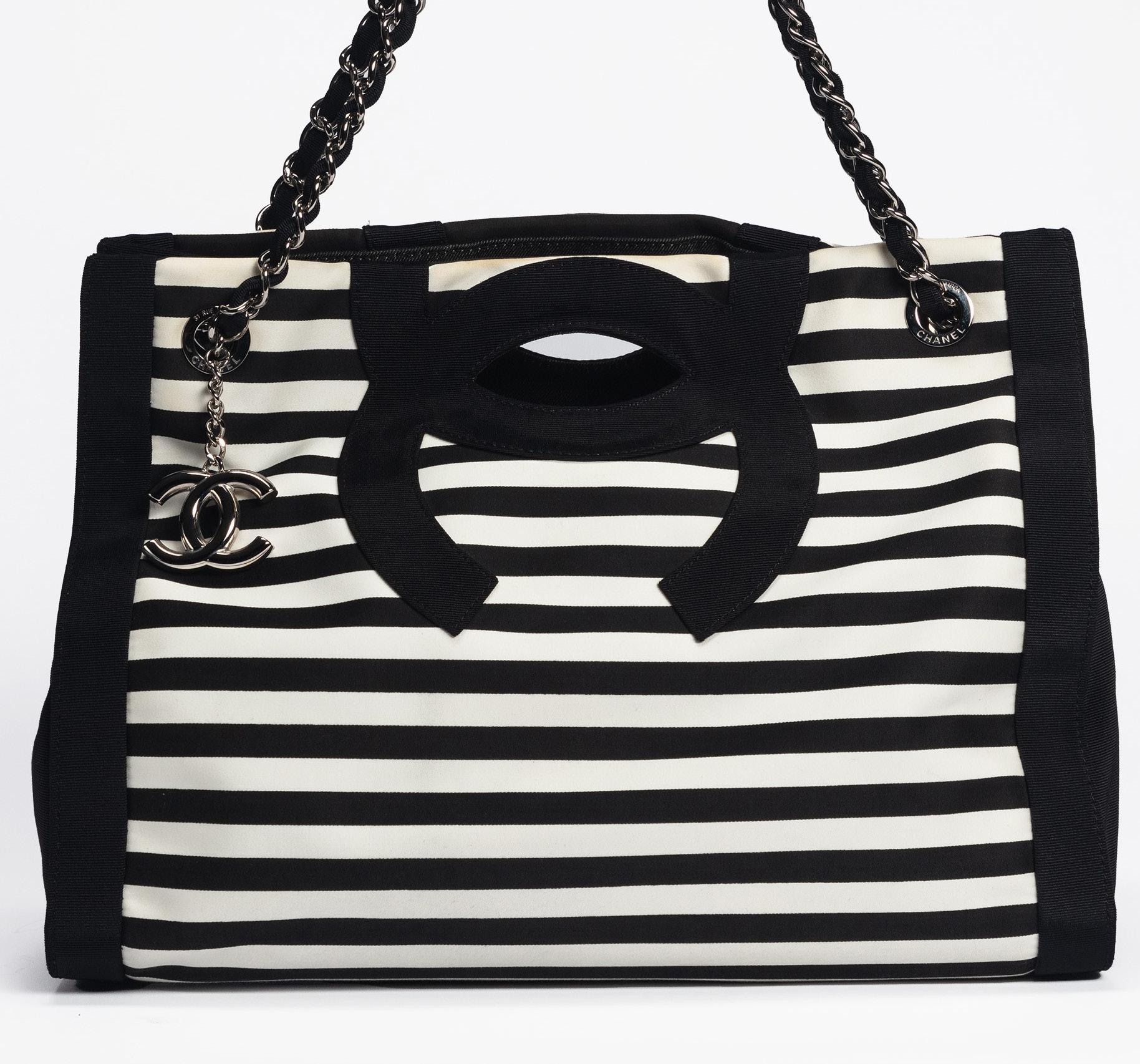 Black and white striped canvas shopper bag, gros grain logo details, metal chain shoulder strap, cm 37 (slight defects), 2009