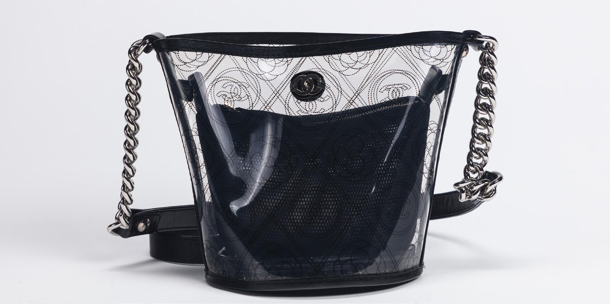 Logo-printed pvc and leather Camelia Bucket, detachable inner pouch, shoulder strap with metal chain inserts, dm cm 15 (slight defects), 2018