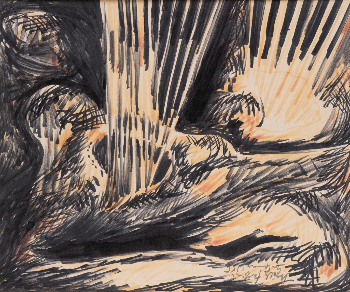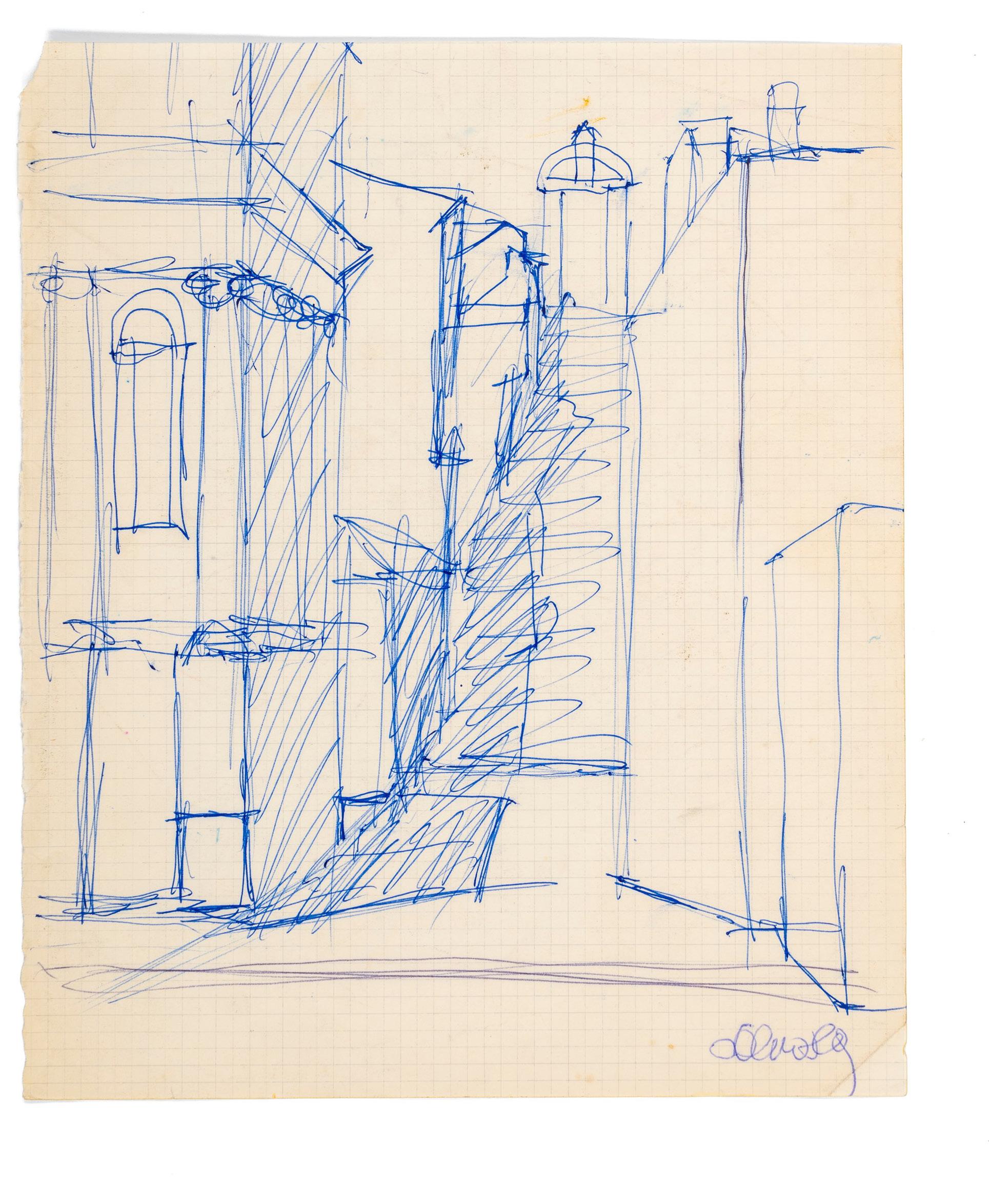 Nota: La piegatura del supporto cartaceo è probabilmente un intervento apocrifo, la misura indicata si riferisce al foglio nella sua completezza, mentre la parte ripiegata ha l’altezza di mm 303 e la base di mm 248. Opera registrata presso l’Associazione per il Patrocinio e la Promozione della Figura e dell’Opera di Mario Sironi
