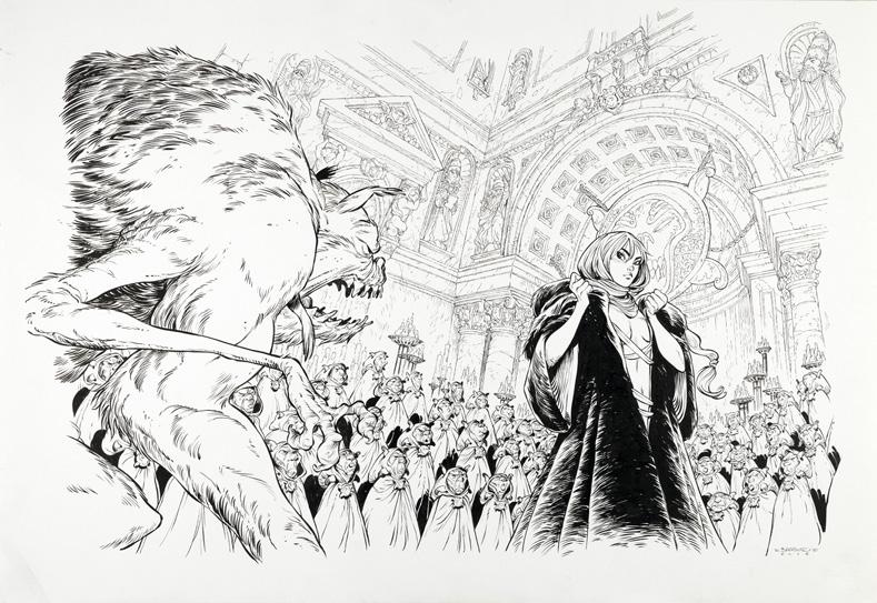 Pencil and ink on thin cardboard. Original cover (and back cover) made by Barbucci for “Ekho: Mirror World - The Secret of the Preshaun” first published in France by Soleil Productions in 2016 and subsequently in Italy by Bao Publishing in 2019. Live crease in the lower left corner. Signed and dated.