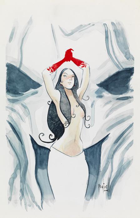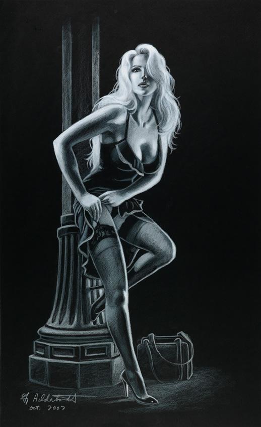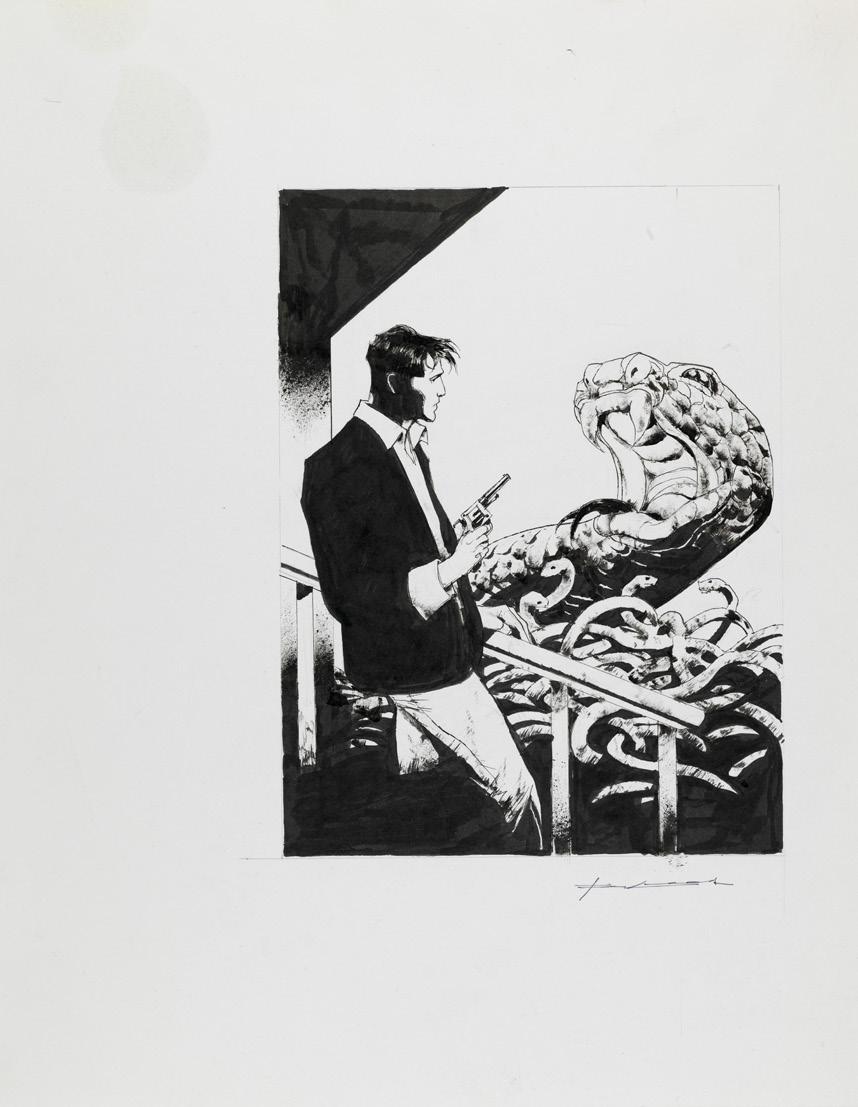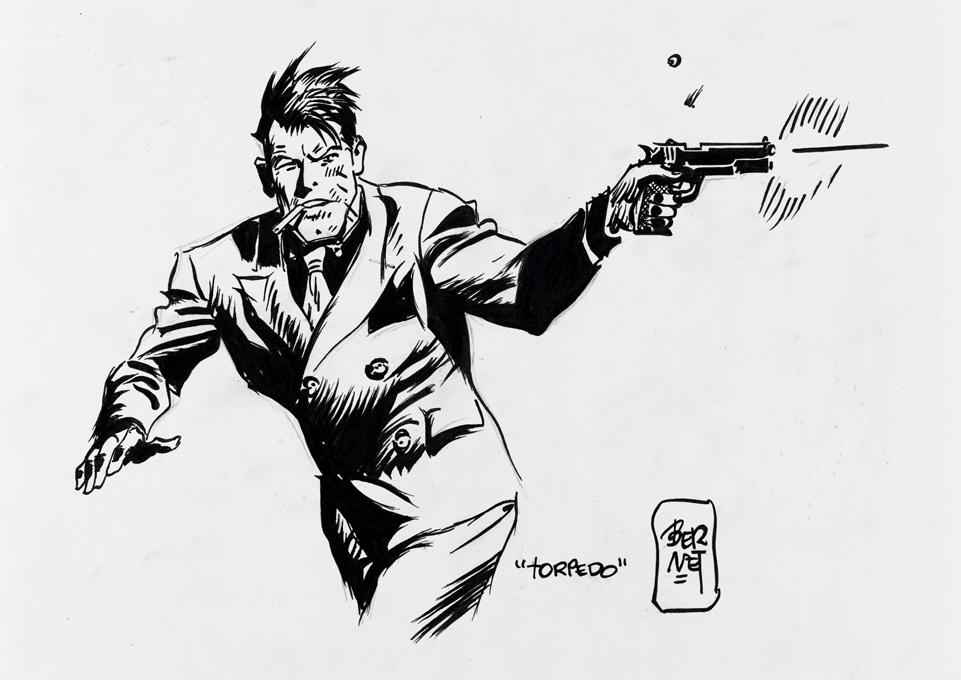 Pencil and ink on thin cardboard. Original illustration made by Bernet for his Torpedo comics during the 1990s. The quintessential antihero, Torpedo is the protagonist of one of the most beloved and celebrated noir comics by audiences around the world, which established the Spanish artist as the undisputed master of the genre. Signed.