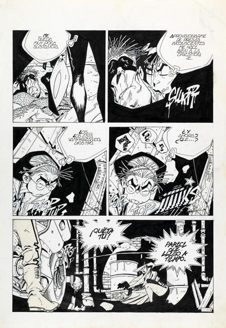 Storia completa composta di 2 tavole originali realizzate da Bernet per l’avventura n. 655 di “Chiara di notte”, pubblicata per la prima volta sulla rivista spagnola El Jueves negli anni ‘90. Una tipica notte di lavoro della nostra Clara scritta con pungente ironica da Trillo e magistralmente disegnata da Bernet. Firmata su entrambe le pagine.