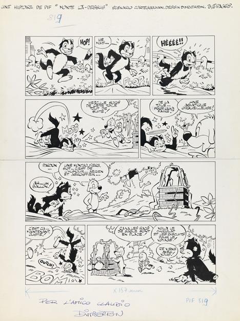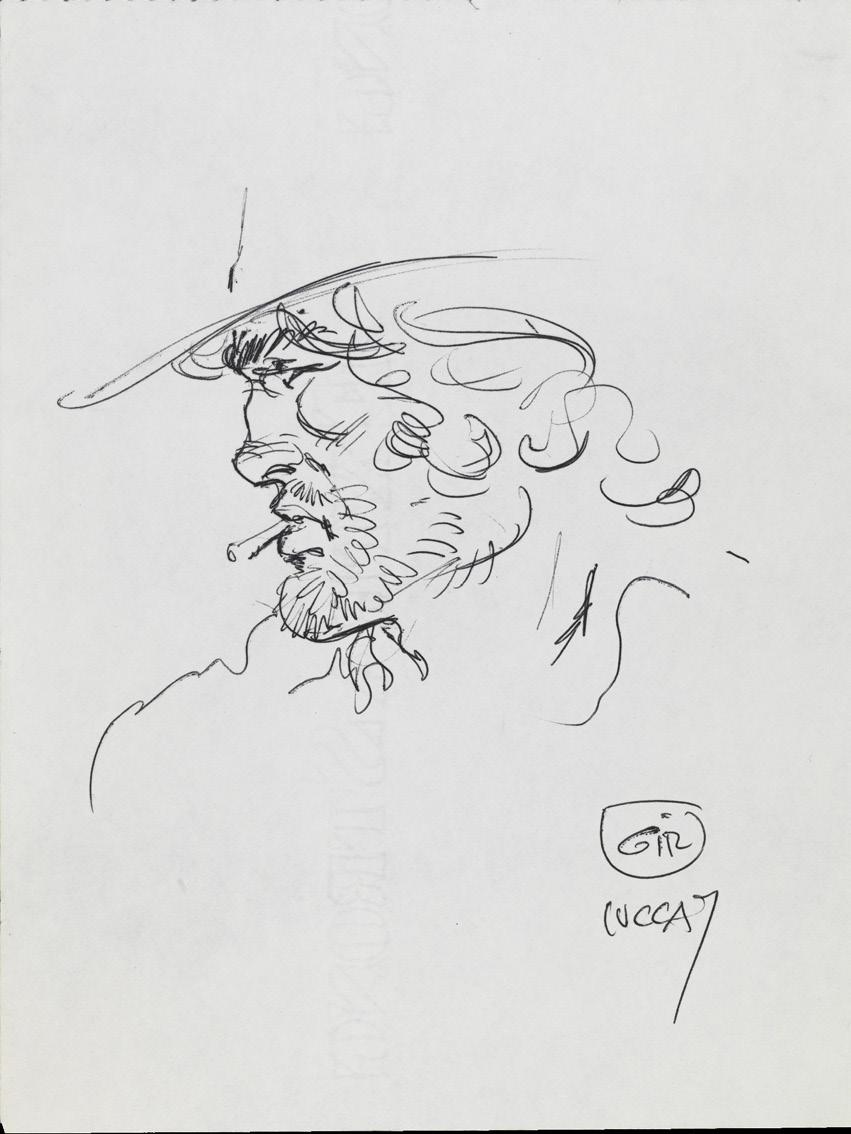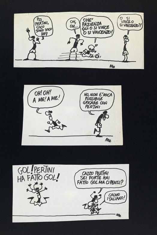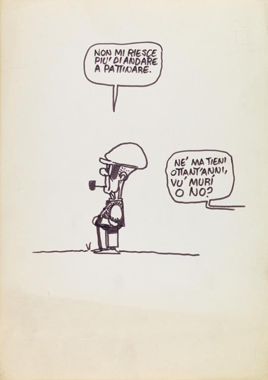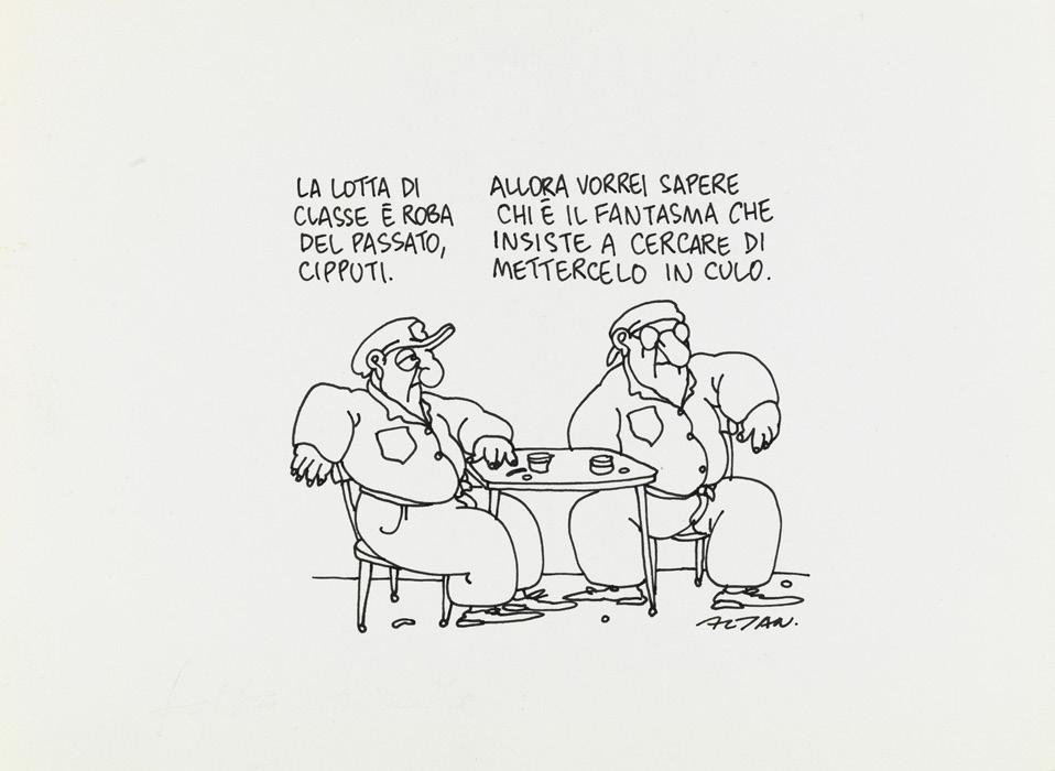 Ink on thin cardboard. Original illustration made by Altan in the 1980s for one of his famous satirical cartoons depicting the communist metalworker Cipputi. Published in the volume “Ten Years Cipputi!” on page 110 by Bompiani in 1987. Signed.