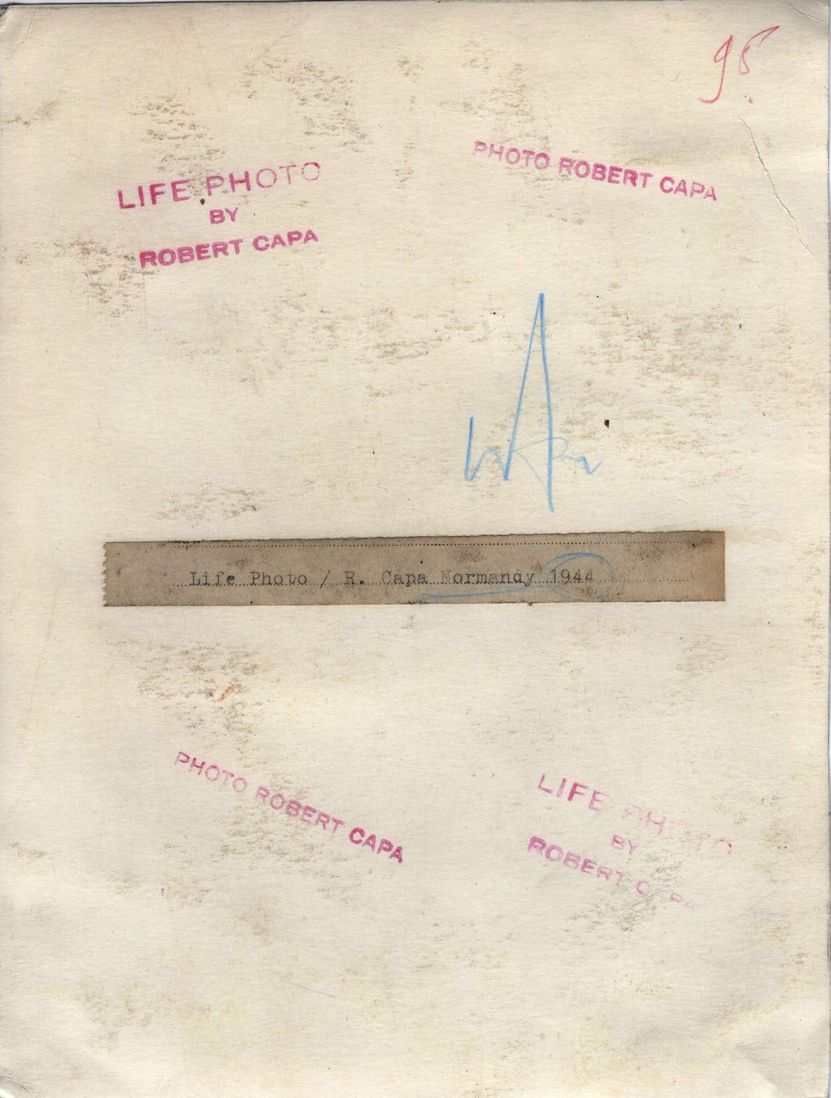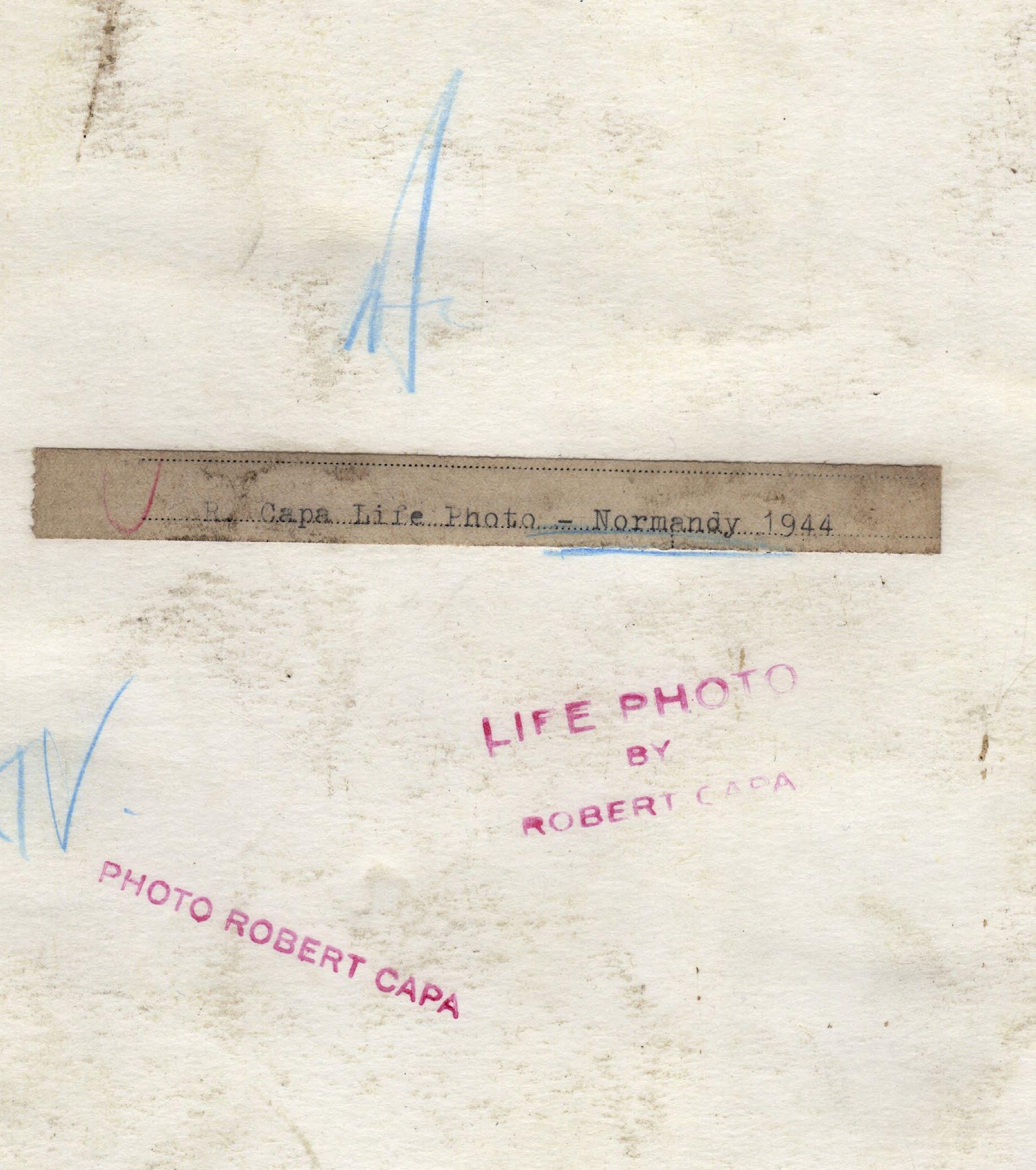 Photo by Robert Capa credit stamps and typescript label R. Capa Life PhotoNormandy 1944 on the verso