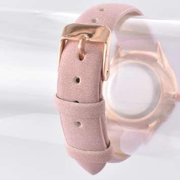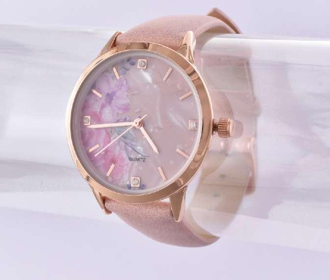 Watch with pink case, pink synthetic leather strap, mother of pearl dial with illustration and pink background, with embossed hour markers and 4 crystals.