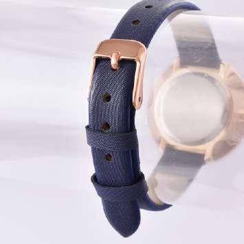 Watch with pink case, decorative crystals, blue synthetic strap and frosted blue dial with embossed hour markers.