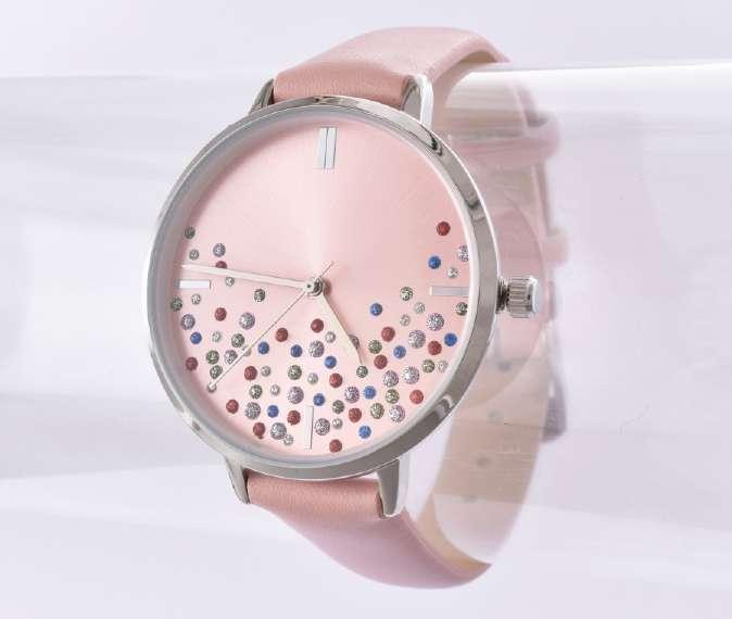Watch with silver colored case, pink synthetic leather strap, pink dial with dot decoration, 4 embossed hour markers.